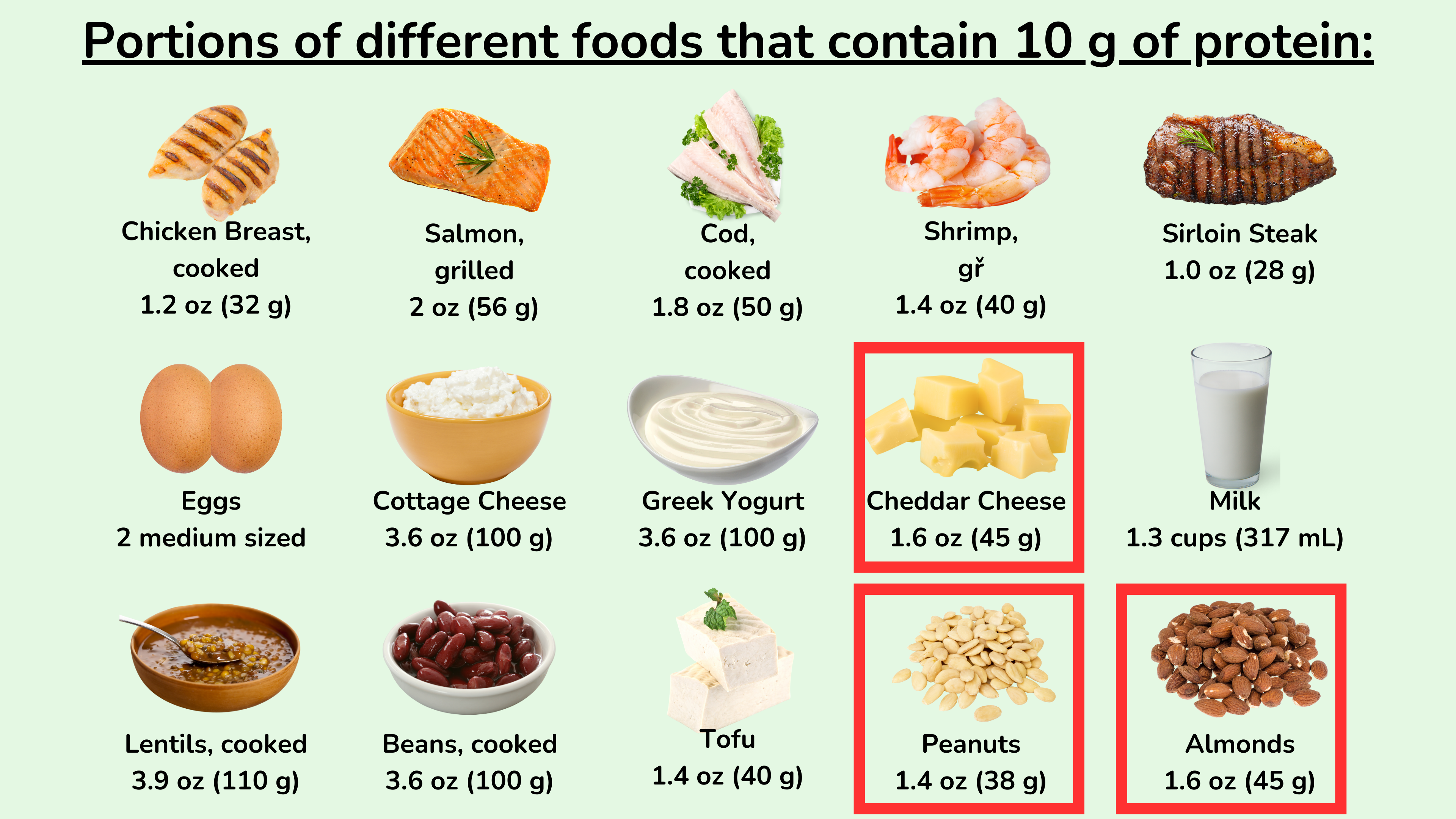 我制作了这张小海报,上面显示了摄入 10 克蛋白质需要吃多少种富含蛋白质的食物。大多数肉类或鱼类只需一两盎司。几个鸡蛋或三到四盎司的奶酪或希腊酸奶。豆类,如扁豆、豆子或豆腐等大豆制品也是很好的蛋白质来源。坚果也是,但就像全脂奶酪一样,坚果有一个特点,使它们不太适合我们在这里讨论的内容,即如何最大限度地提高每卡路里的饱腹感。我们将在这篇博文的后面部分讨论这个问题。