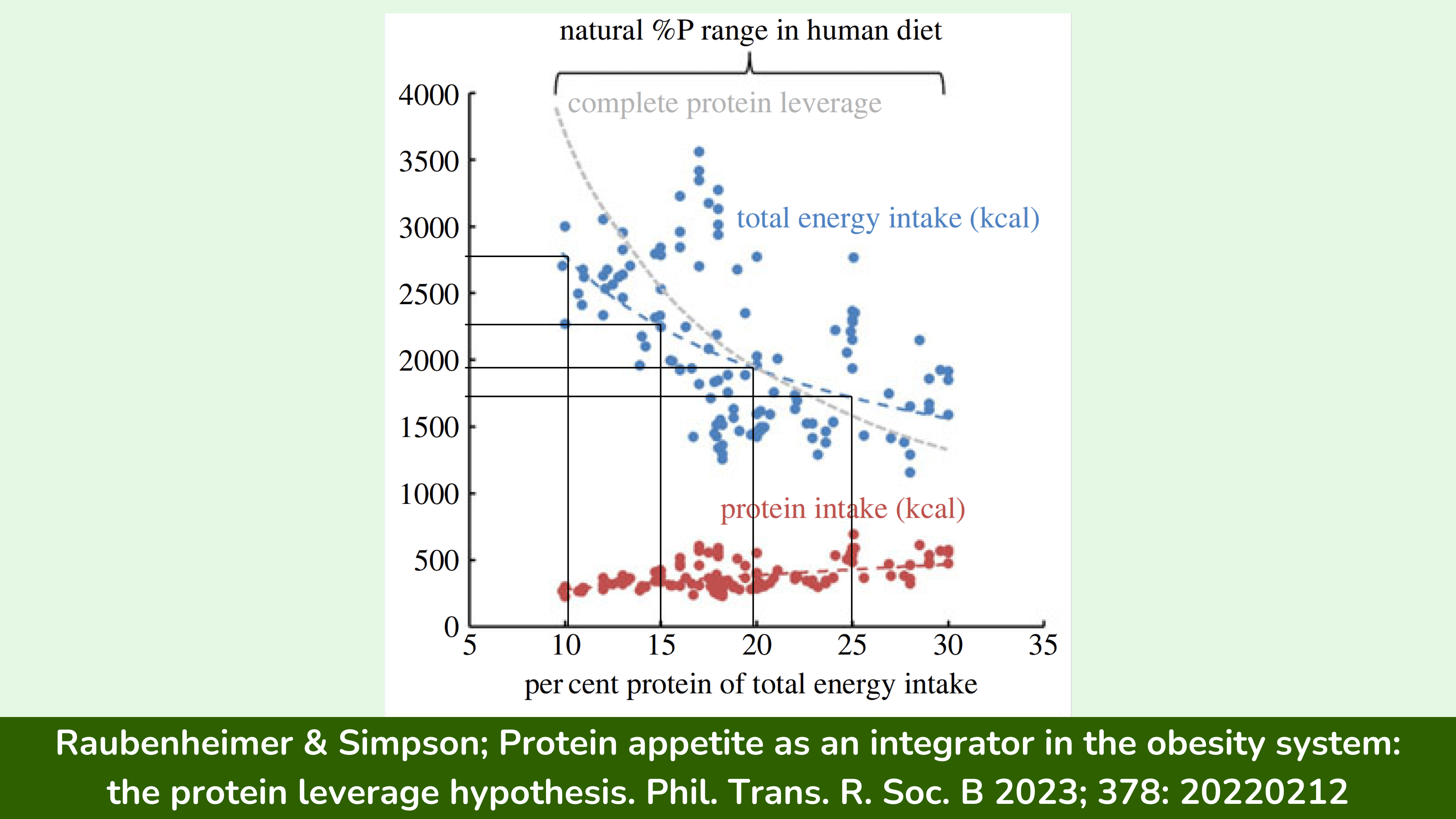 这些数据与我的同事 David Raubenheimer 博士和 Stephen Simpson 博士提出的蛋白质杠杆假说相符,他们提出,包括人类在内的生物不仅对卡路里有胃口,而且对蛋白质也有胃口。在他们的职业生涯中,他们收集了大量数据来支持他们的假说。他们能够证明,从果蝇到昆虫再到各种哺乳动物等各种物种,只要食物中的蛋白质含量低,它们就会摄入更多卡路里。