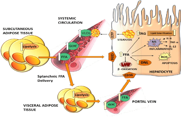 “过多的脂肪分解会导致大量游离脂肪酸 (FFA) 流入肝脏,FFA 会导致脂肪变性并发挥脂毒性作用。甘油三酯酸 (FFA) 流入肝脏,FFA 在肝脏中引起脂肪变性并发挥脂毒性作用。” (右)
