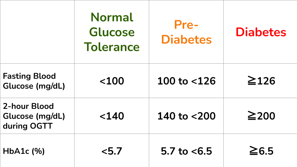 在大多数国家,如果空腹血糖为 126 mg/dL 以上、糖化血红蛋白为 6.5% 以上,或者在口服葡萄糖耐量测试 (OGTT) 中饮用含有 75 克纯葡萄糖的饮料后两小时血糖浓度超过 200 mg/dL,则可诊断为糖尿病。请参阅下表,其中总结了美国糖尿病协会的诊断标准。
