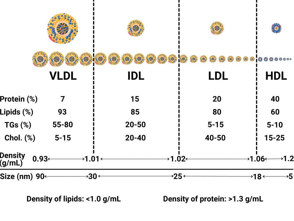 这些脂蛋白都含有脂质,如甘油三酯和胆固醇,也含有蛋白质。不同的脂蛋白所携带的脂质和蛋白质的类型以及脂质与蛋白质的相对比例各不相同。脂质和蛋白质的相对比例会影响其密度。这是因为脂质的密度小于1 g/mL,而蛋白质的密度大于1.3 g/mL。因此,主要由脂质组成的脂蛋白的密度接近1,而含有相对较多蛋白质的脂蛋白的密度约为1.2。
