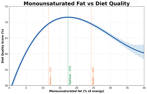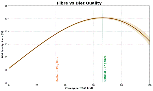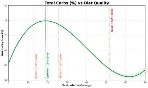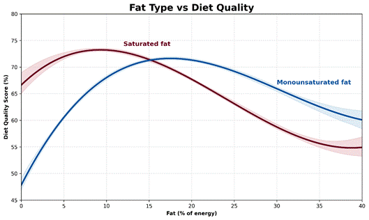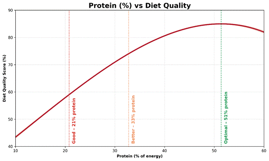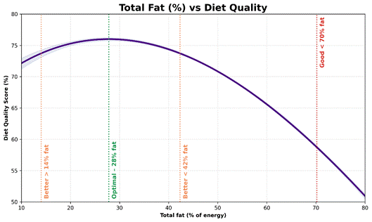 蛋白质是主要因素,但碳水化合物、脂肪、纤维和净碳水化合物的摄入量都有明确的范围,这些范围与更高的饮食质量始终保持一致。* | 范围 | 良好 | 更好 | 最佳 | | — |:—:|:—:|:—:| | 蛋白质 (%) | > 21% | > 32% | 51% | | 总脂肪(%) | < 70% | 14%–42% | 28% | | 总碳水化合物 (%) | < 52% | 13%–26% | 19% | | 饱和脂肪(%) | – | 6%–13% | 9% | | 净碳水化合物 (%) | < 38% | 6%–69% | < 38% | | 单不饱和脂肪 (%) | – | 12%–25% | 18% | | 膳食纤维(克/2000千卡) | – | > 33克 | 67克 | ## 蛋白质:主要杠杆 下图显示了蛋白质百分比与膳食质量评分之间的关系,使用了我们优化器提供的 178,000 天的真实世界数据。  样本曲线(置信区间为 99.9%)使信息表达清晰明确: 蛋白质摄入量越高,饮食质量就越好。* 也就是说,多少蛋白质才算“足够”取决于个人目标。 只是想保持健康?想减脂?还是追求最佳营养密度? 以下是一些可以作为入门练习的实用蛋白质目标: * 良好(蛋白质摄入量>21%)——如果能量来源中超过21%来自蛋白质,那么就优于我们75%的优化者。如果保持适度的运动量,这是一个维持体重和健康的可靠基准。 * 更佳(蛋白质含量>32%)——如果想提高营养密度、减轻体重并感觉更有活力,这是一个强大且可实现的目标。达到此目标,将领先于我们大约一半的优化者。 * 最佳比例(约51%蛋白质)——这与最大营养密度相符,但难以达到。如果蛋白质比例过高,即使氨基酸摄入量仍然很高,也可能导致必需脂肪和微量营养素的摄入不足。  美国新膳食指南最重要的变化之一是更加重视蛋白质,将目标摄入量从每公斤体重 0.8 克提高到每天每公斤体重1.2-1.6 克。  如果想增加蛋白质摄入量而不摄入过多能量,请查看我们社区资源部分中的富含蛋白质的食物清单和信息图。  ## 总碳水化合物:减少,但并非为零 随着蛋白质摄入量的增加,精制碳水化合物的摄入量自然会减少。 对于日常维持,碳水化合物摄入量低于总能量的50%即可。但如果目标是提高营养密度,那么碳水化合物摄入量占总能量的13%至26%通常是最佳选择。  植物性食物可以提供一些仅从肉类、乳制品和海鲜中难以获得的补充维生素和矿物质,因此,为了获得饱腹感和微量营养素的补充,摄入一些碳水化合物通常比不摄入要好。 ## 纤维:无声的加速器 一旦碳水化合物摄入量得到控制,纤维就成为重要的辅助手段。 数据显示,饮食质量持续改善,纤维摄入量达到每 2000 千卡约 67 克。  这个目标很远大,所以更现实的起点是33 克/2000 千卡——足以领先于我们一半的优化者。 纤维可以增加食物体积,减缓消化速度,增强饱腹感,往往与微量营养素一起被吸收——这使得纤维与更高的蛋白质含量一起,成为能做的最可靠的升级之一。 营养丰富的蔬菜往往富含纤维、营养成分高、能量低。  ## 净碳水:比总碳水更合适的指标 与蛋白质和膳食纤维一样,净碳水化合物也是能量来源较少的食物。如的目标是提高饱腹感和营养密度,那么控制净碳水化合物的摄入量通常比追踪总碳水化合物的摄入量更有效。 * 净碳水摄入量低于38%适合维持体重。 * 8-20%的净碳水含量与较高的营养密度相符。 * 14%的净碳水含量对应于最高质量的膳食。  需要控制血糖的人可能更喜欢这个范围的较低端。 ## 脂肪 脂肪通常是人们最后调整的因素,而且往往是最难调整的。 在我们的20/20 宏量营养素课程中,最大的挑战不是碳水化合物,而是在减少多余脂肪的同时摄入足够的蛋白质。 * 脂肪摄入量低于70%适合维持体重,尤其是在碳水化合物摄入量较低的情况下。 * 14-42%的脂肪含量比我们一半的优化者具有更好的营养密度。 * 约28%的脂肪含量与最佳饮食质量始终保持一致。  ## 但哪种脂肪才是“最好”的呢? 人们喜欢争论好脂肪和坏脂肪,但实际上,真正有问题的脂肪只有那些只提供能量而不提供营养的脂肪。 这通常表现为: * 添加到超加工食品中的精炼植物油 * 大量的黄油、奶油或 MCT 油(这些都会增加人们并不真正需要的能量)。 大多数天然食物都含有多种脂肪。肉类和乳制品往往饱和脂肪含量较高,而植物性食物则往往单不饱和脂肪和多不饱和脂肪含量较高。  数据显示,最佳营养密度往往出现在以下范围内: * 单不饱和脂肪占能量的12%至25%。 * 饱和脂肪占总能量的 6% 至 13%。   这可能更多地反映了食物选择,而非生理需求或食欲。以植物性食物为主的饮食往往含有较高比例的单不饱和脂肪;而以肉类和乳制品为主的饮食则往往含有较高比例的饱和脂肪。 如果蛋白质和碳水化合物摄入量合适,就不需要对脂肪类型进行精细管理。 ## 如何做到这一点(而不至于崩溃) 我并不热衷于限制碳水化合物、脂肪、饱和脂肪、糖或其他任何营养成分的摄入。 大多数人都不想永远追踪食物摄入量——而且严格的限制往往会带来更多的恐惧和困惑,而不是清晰的认知。 与其关注应该避免什么,我更希望人们优先考虑那些能够可靠地提高饱腹感和营养密度的食物:蛋白质或纤维(即含有微量营养素的真正食物)。 https://optimisingnutrition.com/nutrient-density-guardrails-and-training-wheels/ </markdown>