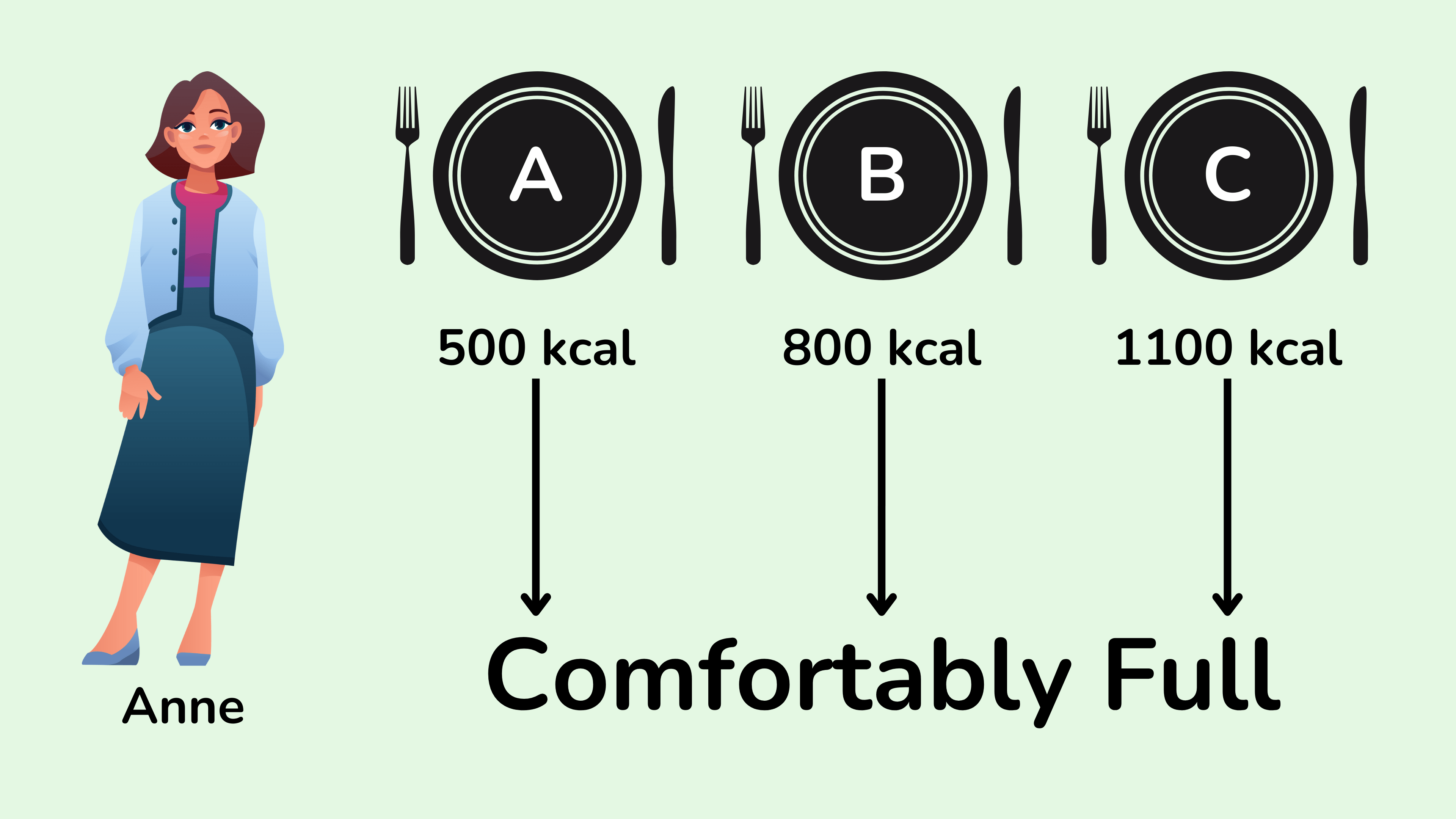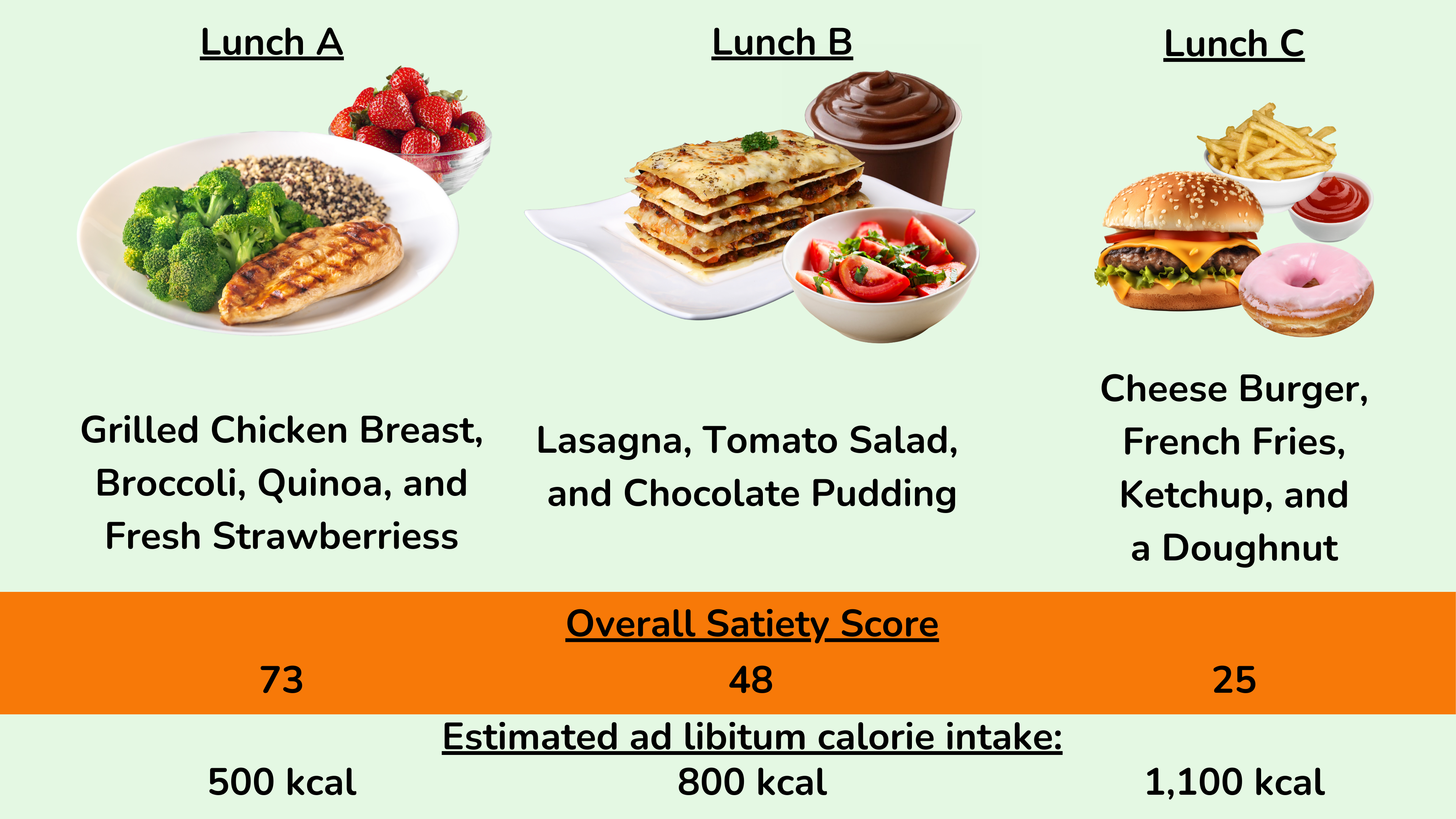 好吧,如果我们使用饱腹感评分来设计这些餐点(见上图示例),那么餐点 A 可能由烤鸡胸肉、一些西兰花、煮熟的藜麦或米饭以及一些新鲜水果或浆果作为甜点组成。总体而言,这顿饭的饱腹感评分非常高,为 73,这里要理解的关键点是,即使安妮可以无限量地享用这顿饭,由于这些食物的特殊性质,她也很难摄入过多的卡路里。它们富含蛋白质和纤维,而且总能量密度非常低。所以如果她吃到很饱,她可能会摄入大约 500 千卡的热量。
