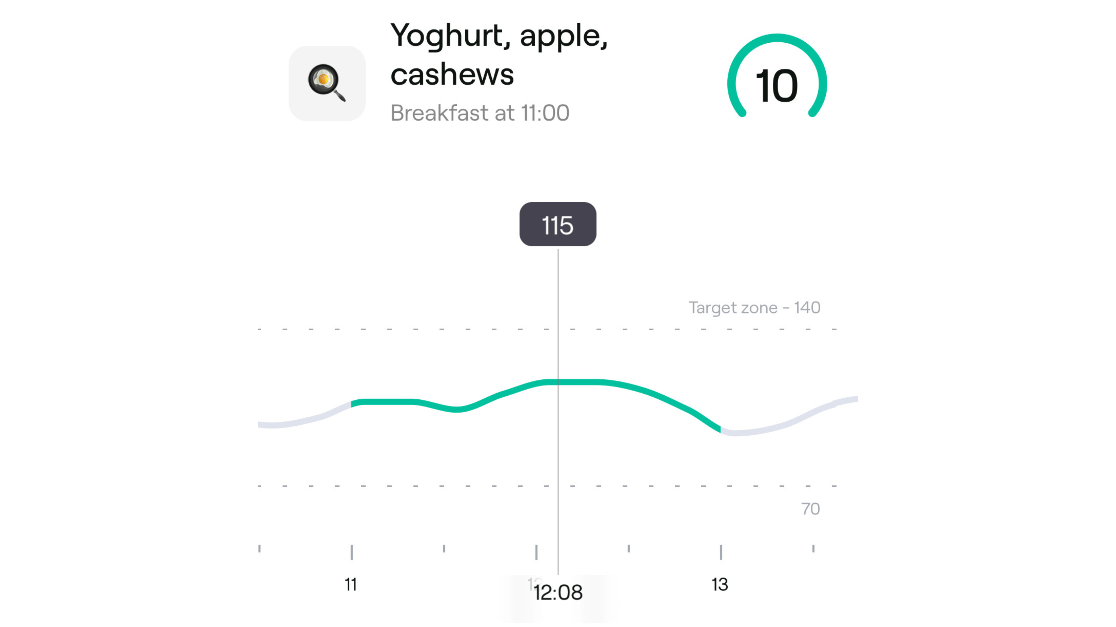 碰巧的是,现在我大多数日子的早餐都是原味酸奶、一个小苹果和一把坚果。下图中是我的血糖水平变化。那天我吃早餐比较晚,上午 11 点。饭前我的血糖水平约为 105mg/dL,因为我已经喝了几杯加奶的茶。饭后,我的血糖水平非常缓慢地上升到 115 mg/dL 左右,然后又回到了 90 mg/dL 左右。