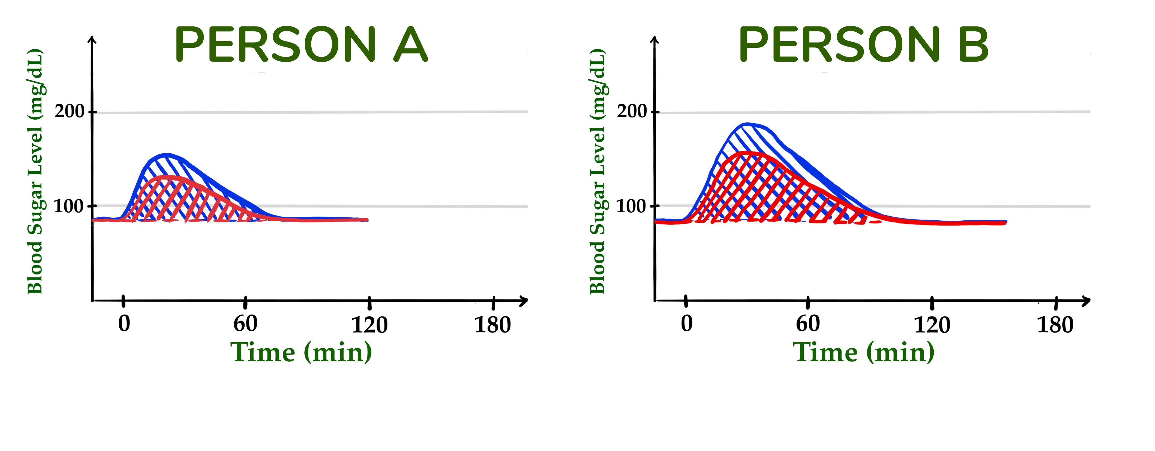 一般来说,按照最新的标准,血糖指数是基于没有患糖尿病或糖尿病前期的健康人的血糖反应,因此这已经减少了人与人之间的差异。但即使甲对糙米等食物的血糖反应比乙小得多,甲对葡萄糖饮料的反应也可能比乙小得多,因为甲可能更耐葡萄糖。可能的结果是,两个人的红色区域相对于蓝色区域的关系可能相似。