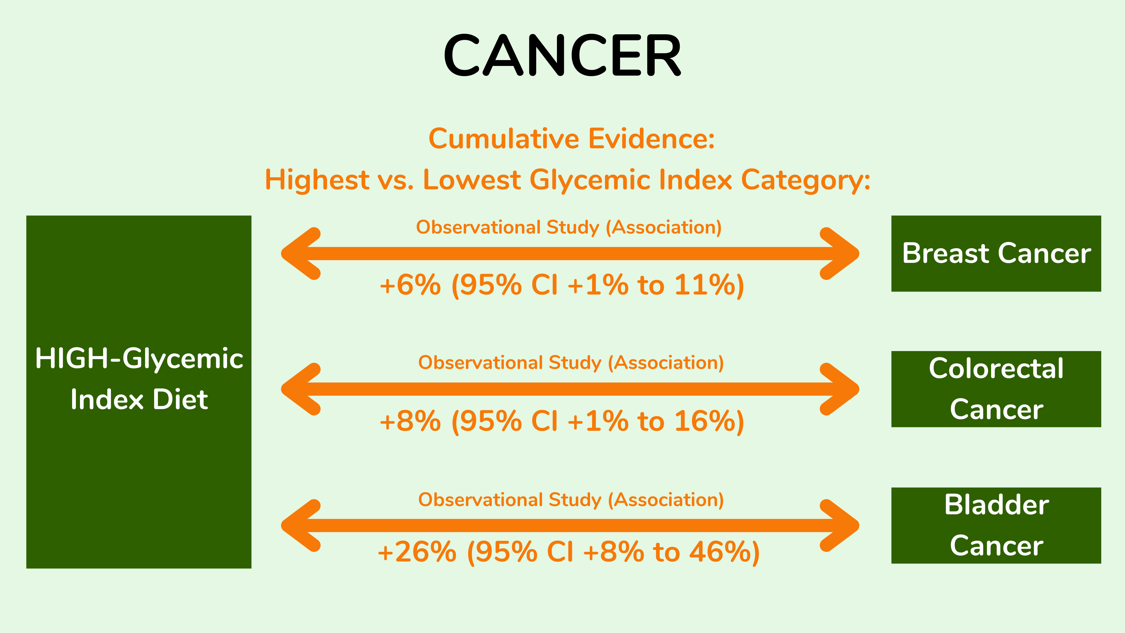 总体而言,观察性研究的荟萃分析发现,高血糖指数饮食会增加乳腺癌、结直肠癌和膀胱癌的风险,但饮食血糖指数与其他类型癌症之间没有显著关联。