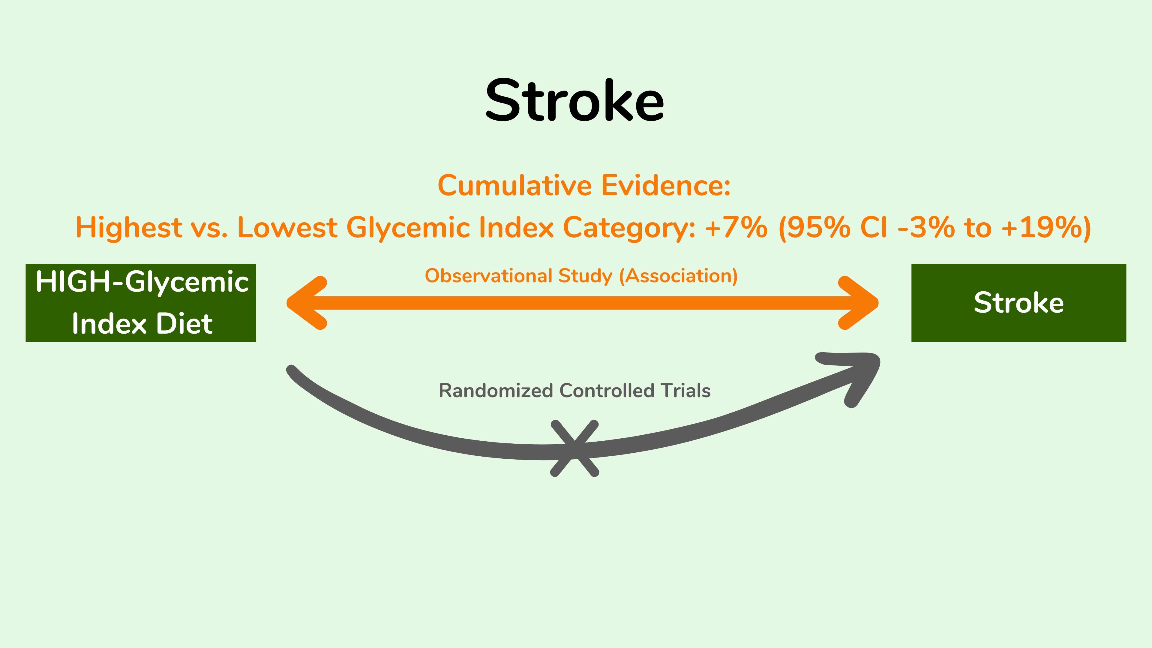 对于中风,数据表明高血糖指数饮食和低血糖指数饮食之间没有统计学上的显著差异。在下图中,95% 置信区间包括零值,因此如果我们反复进行这些研究,我们不能至少 95% 地确信,在至少 95% 的时间里食用高血糖指数饮食的群体中风的风险会更高。