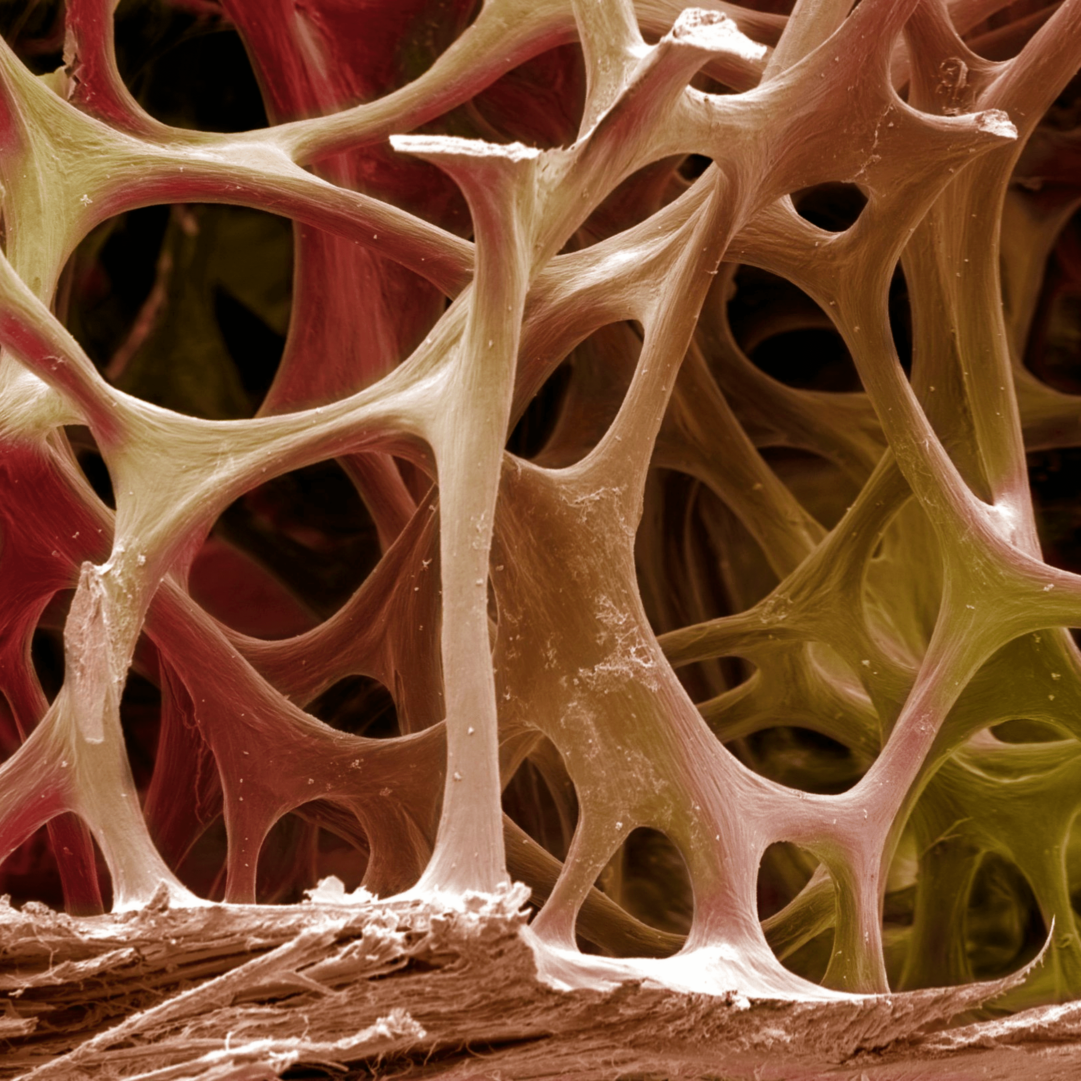 人体骨骼的形成方式其实非常有趣,我想简单解释一下,因为它说明了为什么饮食质量对骨骼健康如此重要。当你看骨头时,它看起来坚实、坚硬、结实。但如果你通过电子显微镜观察它,你会看到更类似于下面这张图片。