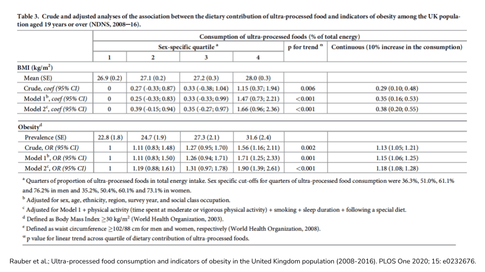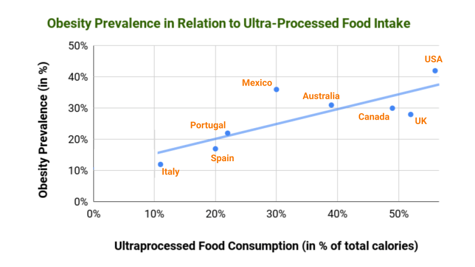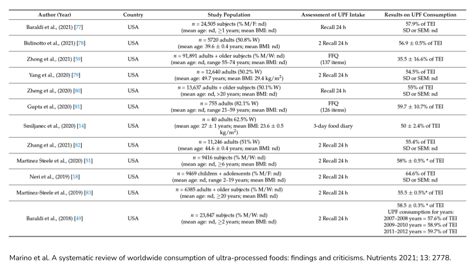 您可能会注意到,这些食品与我们在上一篇文章中讨论的与全球肥胖流行病相关的超加工食品有很多相似之处。提醒一下,这些食品往往是工业设计和生产的食品,富含盐、添加糖和添加脂肪和油,以及人工色素、人工香料、增味剂、乳化剂和许多其他“烹饪制剂中不常见的物质”。