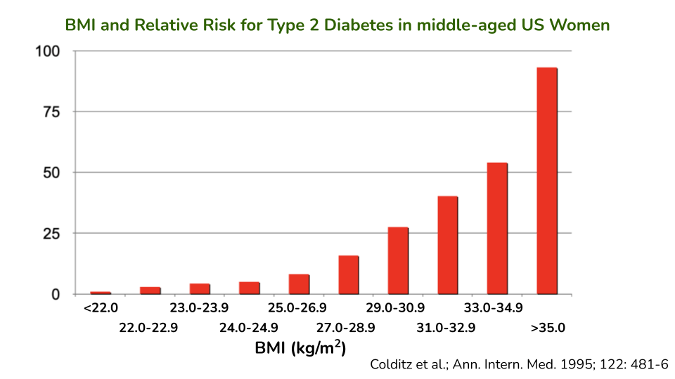 现在,这是一个重大的健康问题,因为肥胖会大大增加患 2 型糖尿病的风险。上图显示,BMI 超过 35 的女性患糖尿病的风险比 BMI 低于 22 的女性高出约 93 倍。对于肥胖者(BMI 超过 30),风险至少比体重最低者高出 26 倍。这只是一项研究,但许多其他研究的数据证实,体内脂肪过多与 2 型糖尿病风险大幅增加之间存在非常强烈且一致的联系。