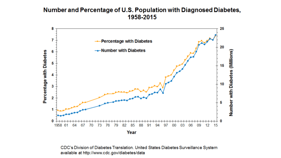 就在 2001 年,当时糖尿病的发病率为 4%,研究人员估计到 2050 年发病率可能达到 7.2%。好吧,再看看上面的图表:我们在 2015 年就达到了 7.2%,比预测早了 35 年!现在对 2050 年的更多分析估计,到 2050 年,三分之一的美国成年人将患有糖尿病,考虑到最近的发展趋势,这个数字似乎并不疯狂。