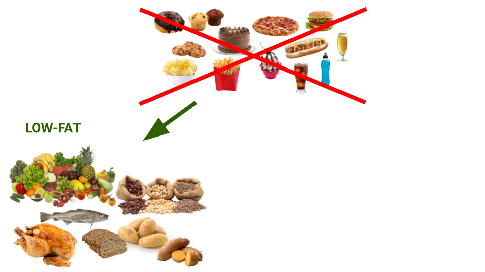 因此,我们上面讨论的糖尿病预防计划中的饮食干预的一个好处是,如果要求人们吃低脂饮食并戒掉垃圾食品,那么人们容易暴饮暴食的所有食物都会突然被禁止,相反,他们可以吃的食物是未经加工的低脂食品,如水果和蔬菜、豆类和扁豆、鱼、瘦肉、全麦、土豆或红薯(见下图)。所有这些都是营养丰富的食物,但如果不添加脂肪或油,食用时就不会特别有吸引力,因此暴饮暴食这些类型的食物会变得相当困难,大多数人会自发减肥。而且,正如糖尿病预防计划所显示的那样,如果人们能够长期保持这种低脂饮食模式,他们减掉的体重就会保持数年之久。