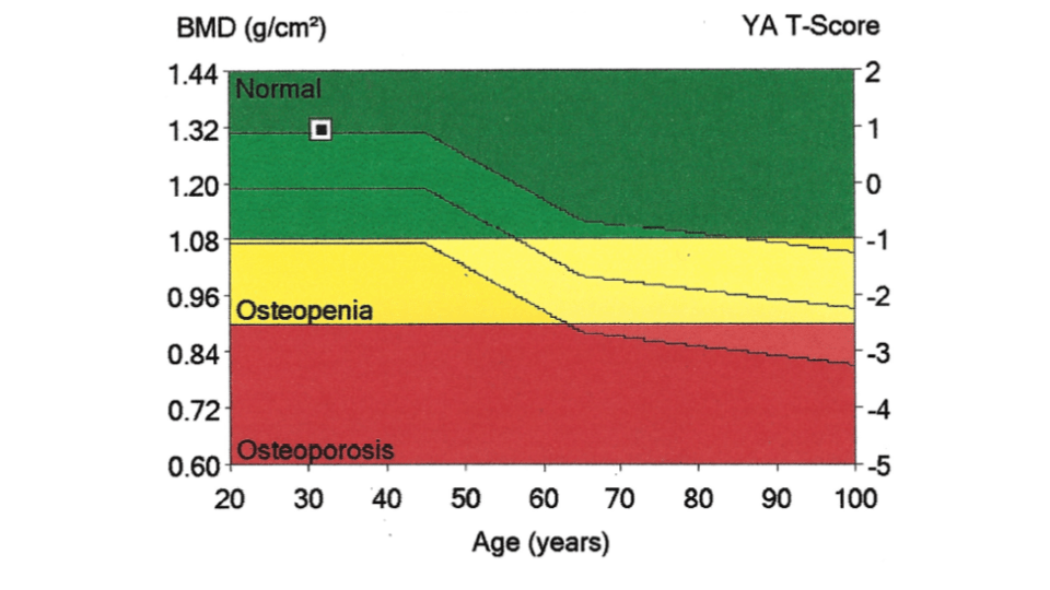 我们在这里看到的另一件事是这三条线随着年龄的增长而向下倾斜:中间的线显示女性成年期的平均骨矿物质密度。上下的线分别表示平均值的上下一个标准差。因此,大多数女性的骨量一生中都会保持在这个范围内。骨矿物质密度通常在 30 岁左右达到峰值。然后,从 40 多岁到 50 岁出头开始,骨矿物质密度趋于下降。由于更年期相关的荷尔蒙变化,女性的骨矿物质密度下降更为明显,但男性也会发生这种情况。可怕的是,许多女性一旦进入 60 多岁和 70 多岁就会患上骨质疏松症,即使她们的骨质密度在我们认为的“正常范围内”。