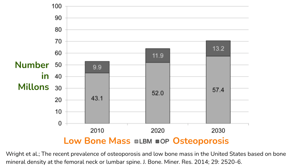 因此,得知骨质疏松症是全世界的主要健康问题可能并不令人意外。即使在平均钙摄入量接近 RDA 的美国,2010 年也有约 1000 万人患有骨质疏松症,另有 4300 万人骨量低,即骨质减少,使他们在晚年容易患上骨质疏松症。根据 2014 年发布的以下估计,这一数字预计还会进一步增长。
