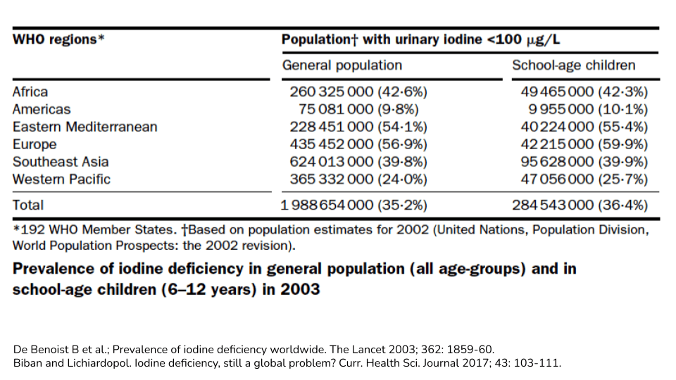 我想谈的另一种非常常见的微量营养素缺乏症是碘缺乏症,这是甲状腺功能减退症(即甲状腺功能低下)的主要原因。甲状腺功能减退症最常见的原因是缺乏必需的微量元素碘。请看下表,据估计,2003 年全球超过三分之一的总人口以及超过三分之一的学龄儿童缺碘。欧洲、东地中海地区、非洲和东南亚的数字尤其令人担忧。但即使在患病率最低的美洲,也有大约 10% 的人缺碘。