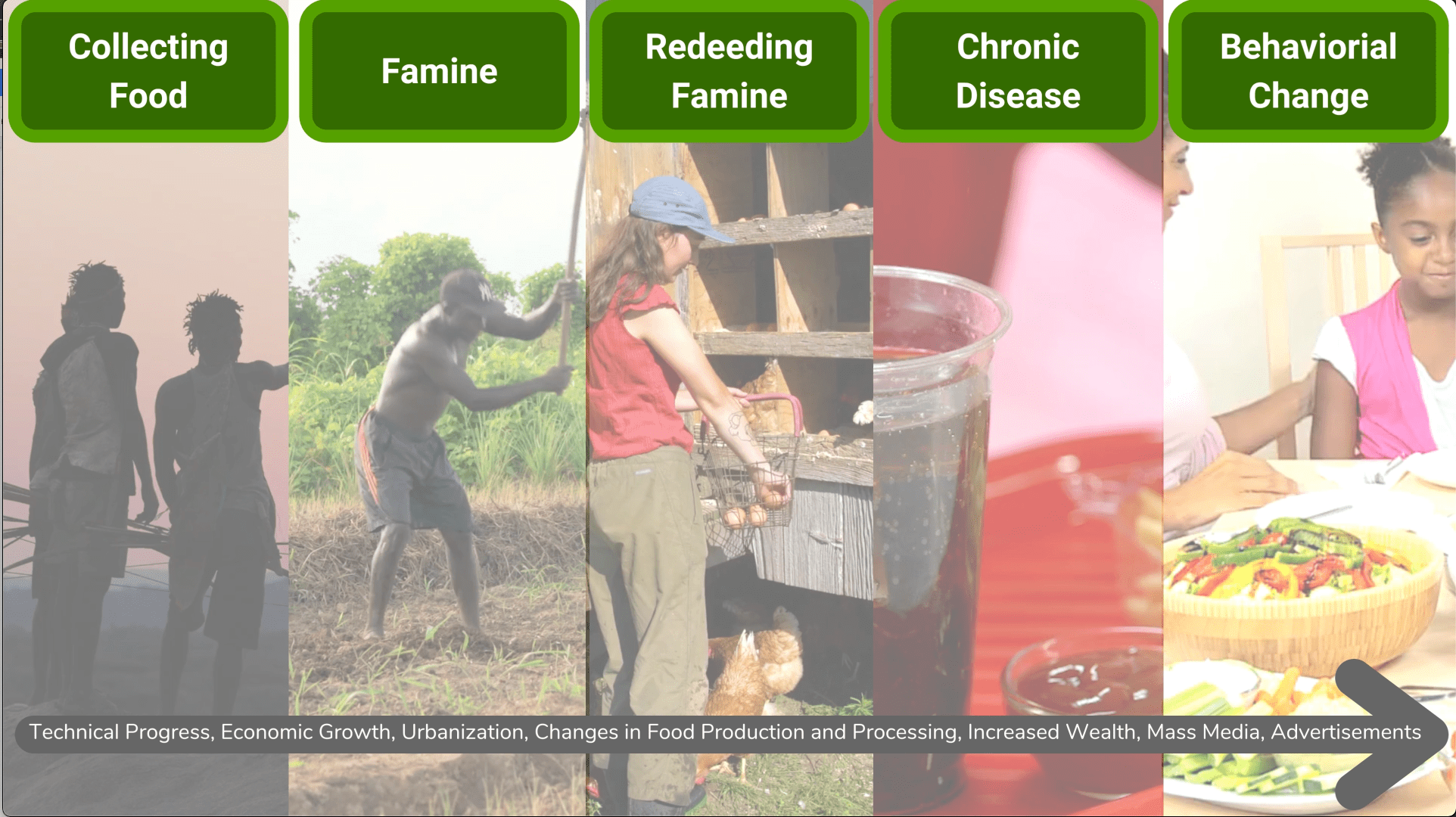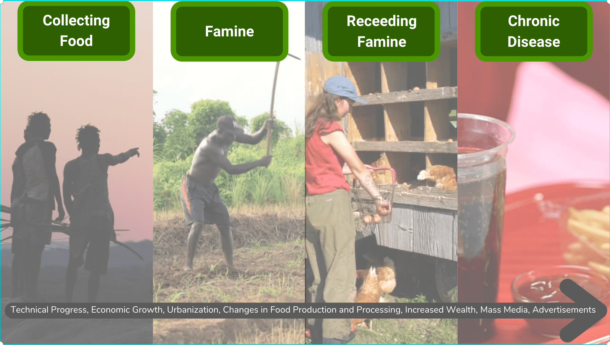 这一转变的特点是整个食品体系发生了重大变化,特别是农业和食品加工的工业化。这一转变的典型特征还包括电视或互联网等大众媒体的普及,以及包括食品在内的广告的大量曝光。