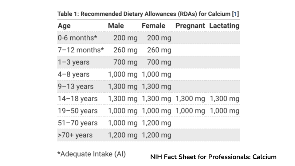 遗憾的是,很多人的饮食中并没有摄入足够的微量营养素来强健骨骼。我们来看看钙的摄入量。中年男性和女性的钙的 RDA(推荐膳食摄入量)为 1,000 毫克/天。对于某些群体,例如青少年或 70 岁以上的男性和女性,RDA 实际上高于每天 1,000 毫克。RDA 是美国根据年龄和性别为不同人群推荐的摄入量,对于女性,还取决于她们是否怀孕或哺乳。对于每种微量营养素,专家委员会都会选择一个标准,并以此为基础确定 RDA。对于钙,RDA 的设定是为了确保大多数人口的钙摄入量足以实现最佳骨矿化。需要澄清的是,这并不意味着每个人每天都需要 1,000 毫克;有些人每天的摄入量可能为 800 或 900 毫克,此时骨矿化程度可能达到最佳。问题在于,如果不进行一系列复杂的测试,您个人无法确切知道您到底需要多少钙,因此,为了确保您的骨骼获得足够的钙,您应该确保定期满足 RDA。