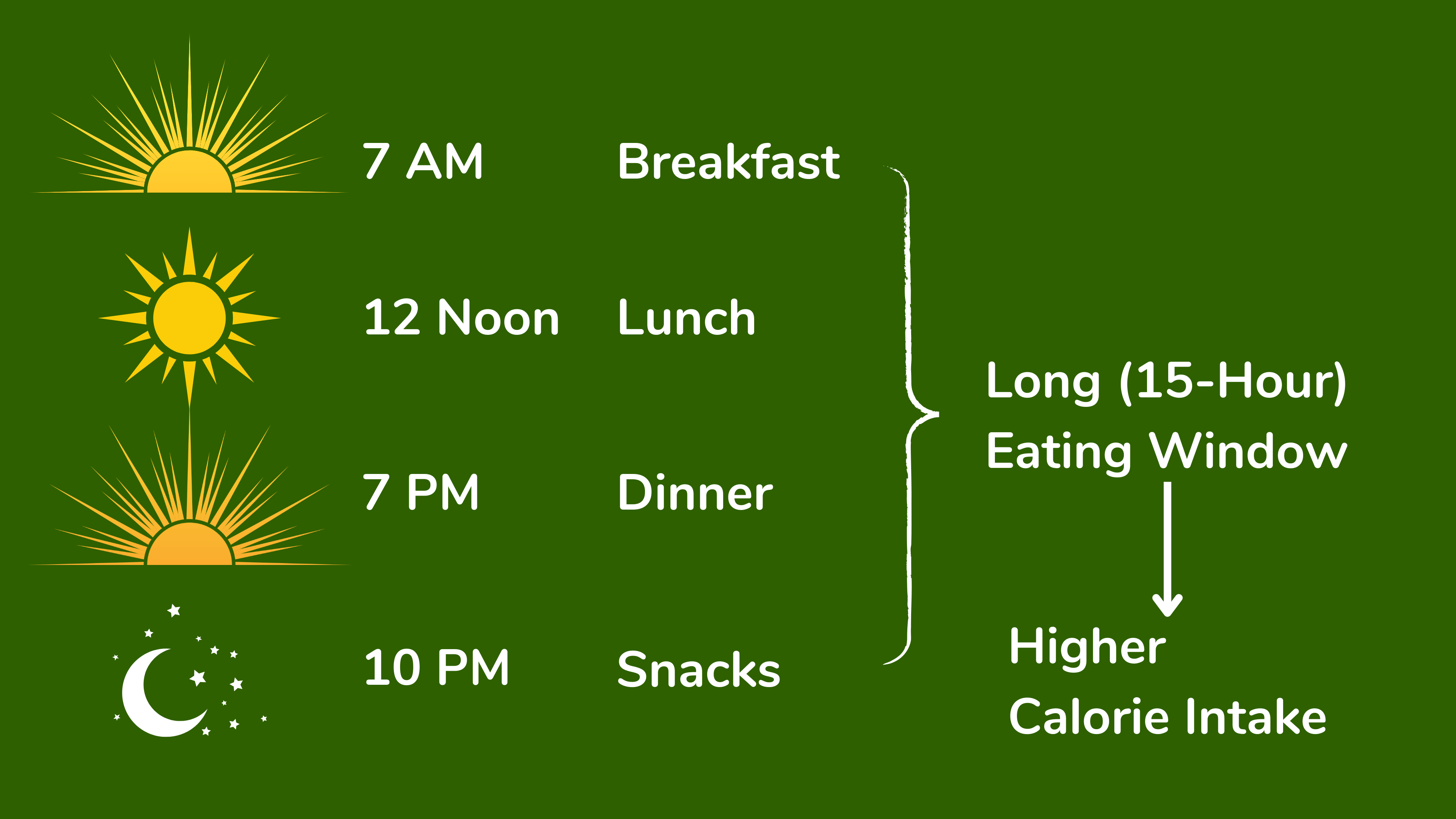 第一个因素,也就是第六点,是如果人们在较长的进食时间内进食,例如,清晨开始吃早餐,然后吃午餐,睡觉前吃零食,往往会摄入更多的热量。