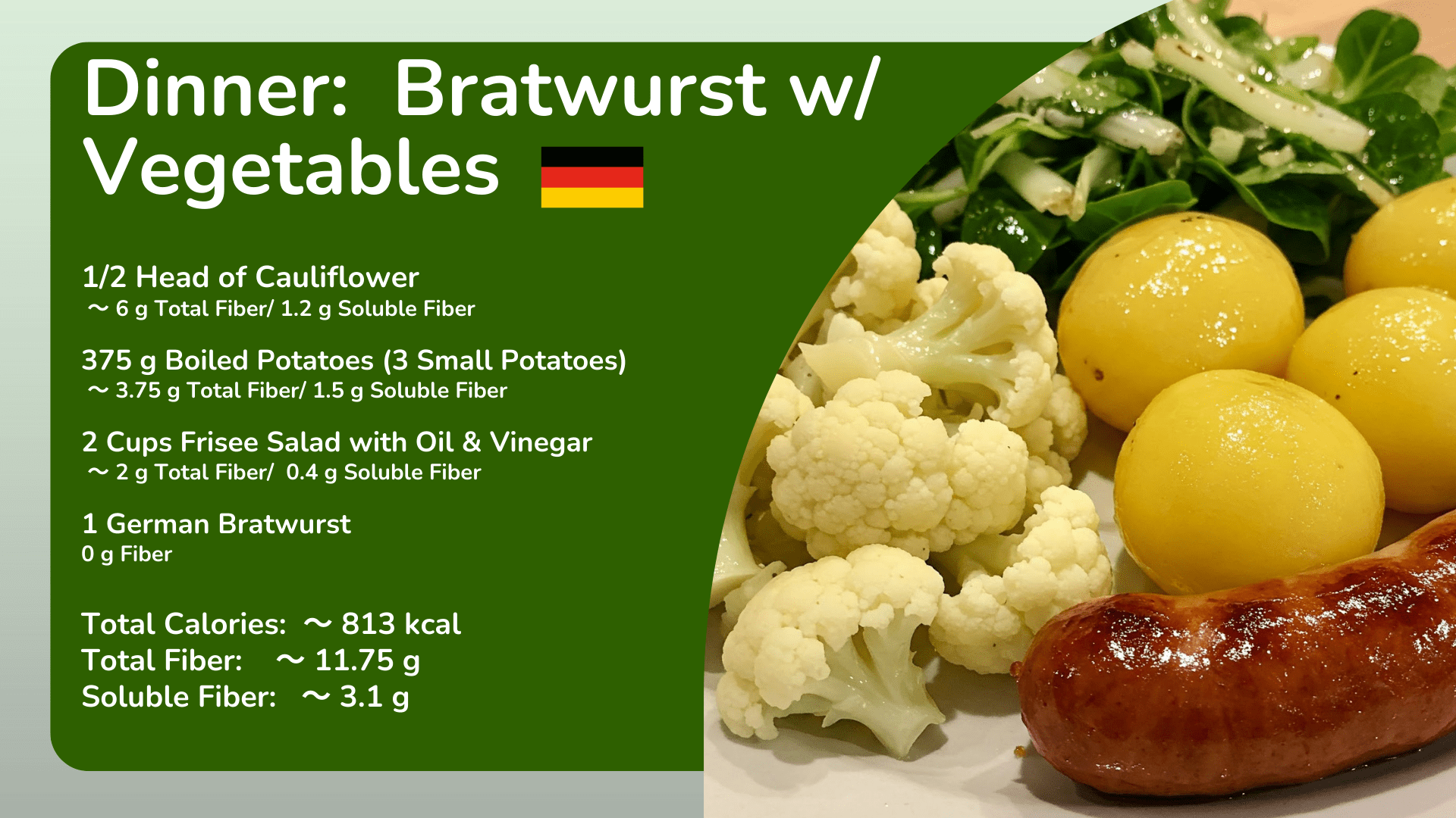 晚餐时,我可能会吃如下所示的混合餐:半个蒸花椰菜、一份沙拉、煮土豆和一份美味的德国香肠。好吧,我是德国人,有时我喜欢吃香肠。德国香肠实际上营养价值并不高,因为脂肪含量高,能量密度高,而一块未经加工的肉在很多方面都更好。但我想在这里加上这一点,以证明如果通常做出正确的选择,不需要一直做到完美。在这样的一顿饭中,我只吃大部分沙拉和花椰菜,而不是主要吃香肠和少量蔬菜。这样的一顿饭最大的问题是,大多数人会吃两三根香肠,然后吃一大堆土豆甚至炸土豆,会忘记蔬菜和沙拉,或者只吃其中一种的小配菜。试着把肉和土豆当作配菜,把重点放在全植物食品上。这是一顿相当丰盛的餐点,热量高达 813 千卡,总纤维含量近 12 克,可溶性纤维含量为 3.1 克。