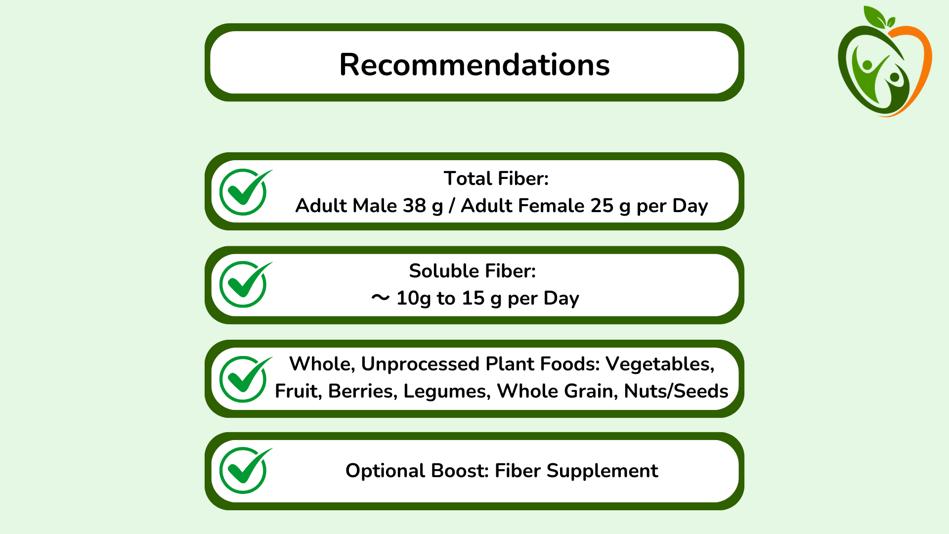 既然已经了解了纤维如何降低 LDL 胆固醇、改善胰岛素敏感性和降低 ASCVD 风险背后的科学原理,那么来谈谈在日常饮食中加入更多纤维的实用方法。 美国营养与饮食学会建议每消费 1000 千卡食物,总纤维含量应为 14 克。对于成年女性,这相当于每天摄入约 25 克膳食纤维,而对于男性,则约为每天 38 克。目前没有关于可溶性纤维的具体指导方针,但根据证据,每天摄入 10-15 克是一个不错的目标。顺便说一句,美国人口的实际总纤维摄入量仅为每天约 15 克——远低于推荐量,因此还有很大的改进空间!