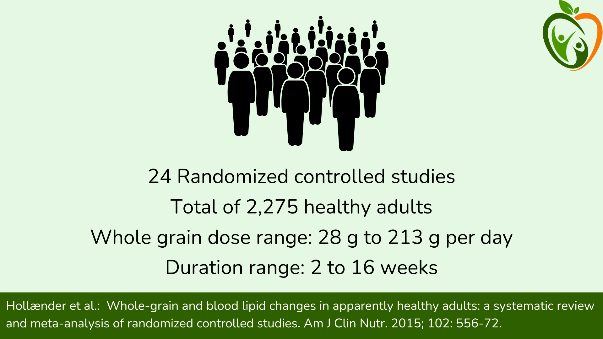 先看看发表在《美国临床营养学杂志》上的一篇对 24 项随机对照试验 (RCT) 的系统评价和荟萃分析,该研究评估了全谷物摄入对总共 2,275 名健康成年人的 LDL 胆固醇和其他血脂的影响,其中一些人的胆固醇水平升高。各项研究中的全谷物量从每天 28 克到每天 213 克不等,显然范围很广,研究持续时间从 2 周到 16 周不等。