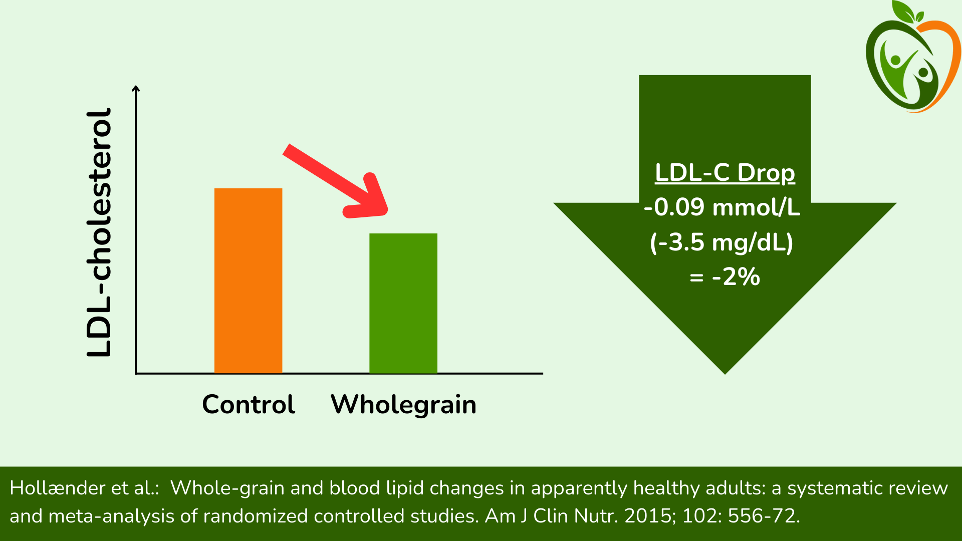 作者发现,总体而言,与控制饮食相比,食用全谷物可降低 LDL 胆固醇。平均降低 3.5 mg/dL,即降低 2%。虽然这具有统计学意义,并且可能具有临床意义,但肯定不足以激励任何人有意义地改变饮食习惯。