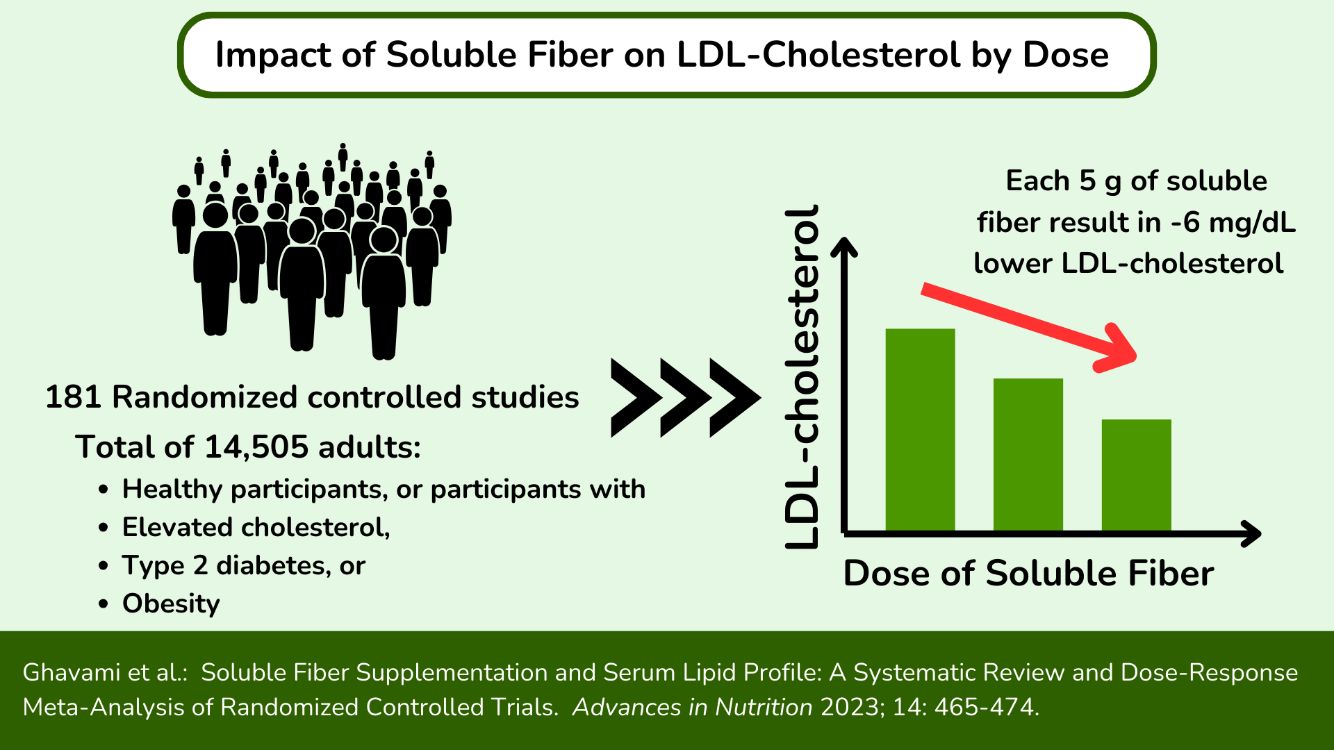 *另一篇系统综述和荟萃分析总结了 181 项随机对照试验,研究了可溶性纤维对 LDL 胆固醇的影响。考虑了 14,505 名成年人的数据,其中包括健康参与者以及胆固醇升高、2 型糖尿病或肥胖症患者。作者估计,每天每增加 5 克可溶性纤维,总胆固醇和 LDL 胆固醇平均会降低约 6 mg/dL。
