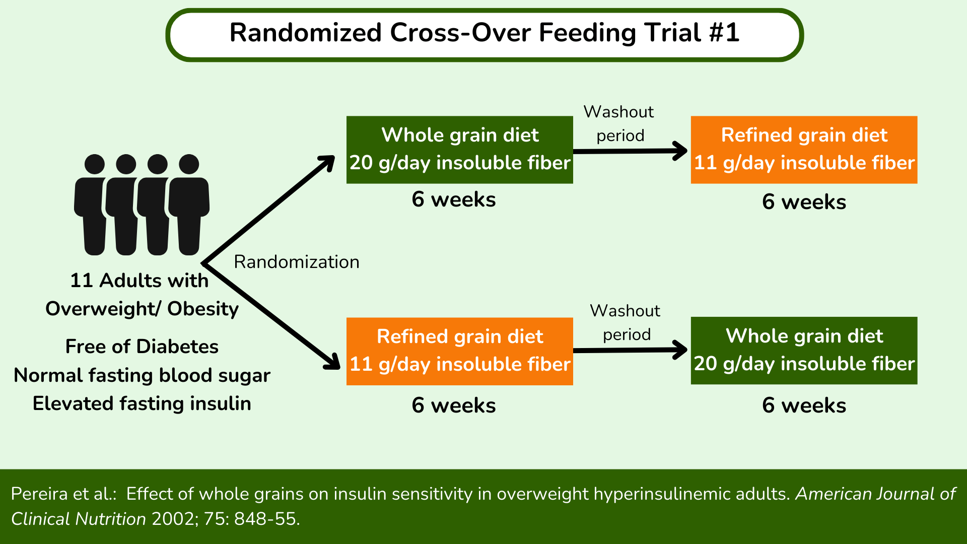 在《美国临床营养学杂志》发表的一项随机交叉对照喂养试验中,11 名体重超重或肥胖且未患糖尿病的成年人,空腹血糖正常但空腹胰岛素升高(表明存在胰岛素抵抗),连续 6 周每天食用含有约 20 克不溶性纤维的全谷物饮食,或每天食用含有约 11 克不溶性纤维的精制谷物饮食。6 周后,参与者经过 6-9 周的洗脱期,然后改用另一种饮食。
