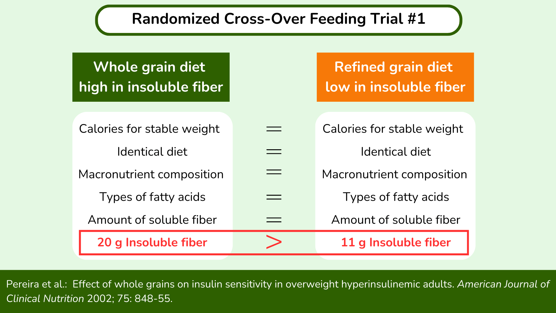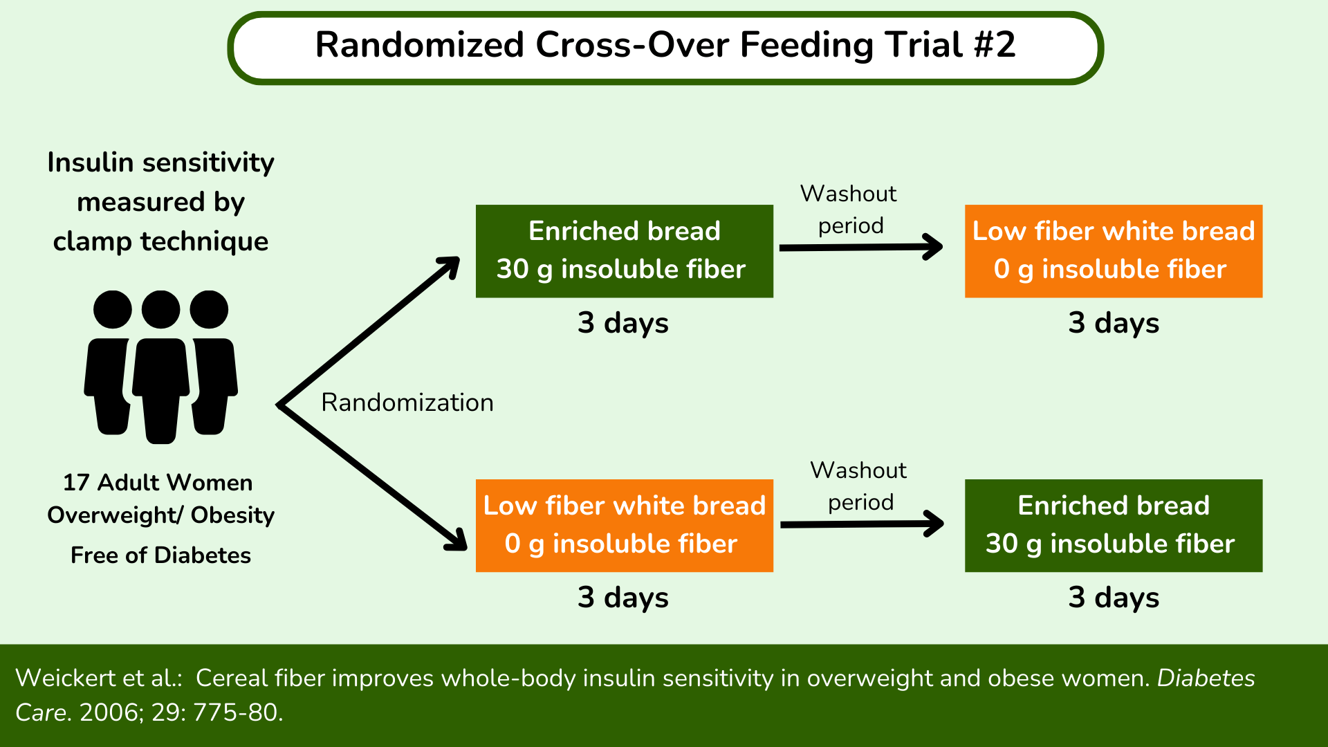 *另一项研究*随机交叉对照喂养试验使用金标准钳制技术再次评估了 17 名非糖尿病的超重或肥胖女性的胰岛素敏感性,这些女性在食用低纤维白面包或专门富含不溶性纤维的白面包 3 天后均是如此。治疗组的纤维量约为 30 克不溶性纤维,而对照组则没有不溶性纤维。因此,该研究中的干预期要短得多,但不溶性纤维摄入量的差异要明显得多。其余饮食的常量营养素组成相同,进行了能量调整以确保参与者保持体重。经过一段洗脱期后,参与者改吃另一种饮食,所以每个人都完成了两种饮食。在参与者食用富含不溶性纤维的面包仅仅 3 天后,胰岛素敏感性再次显着增加。