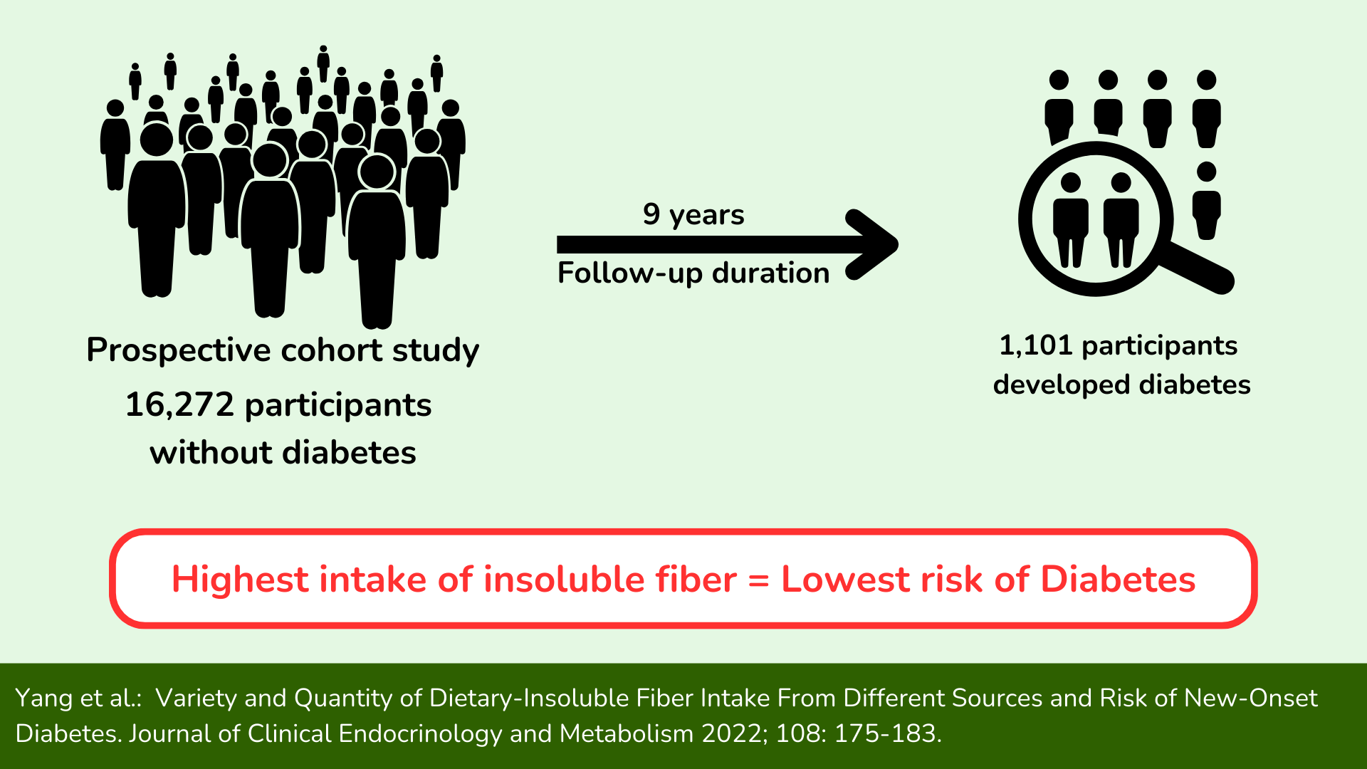 例如,最近在中国进行的一项大型前瞻性队列研究跟踪了 16,272 名未患糖尿病的参与者。在平均 9 年的时间内,1,101 人患上了糖尿病。作者发现,从各种来源摄入最多不溶性纤维的人患糖尿病的风险最低。值得注意的是,摄入更多不同类型的不溶性纤维也与患 2 型糖尿病的风险较低有关。这与其他队列研究的结果非常一致,这些研究表明,与食用低纤维饮食的人相比,食用高纤维饮食的人患 2 型糖尿病的风险要低 15-30%。