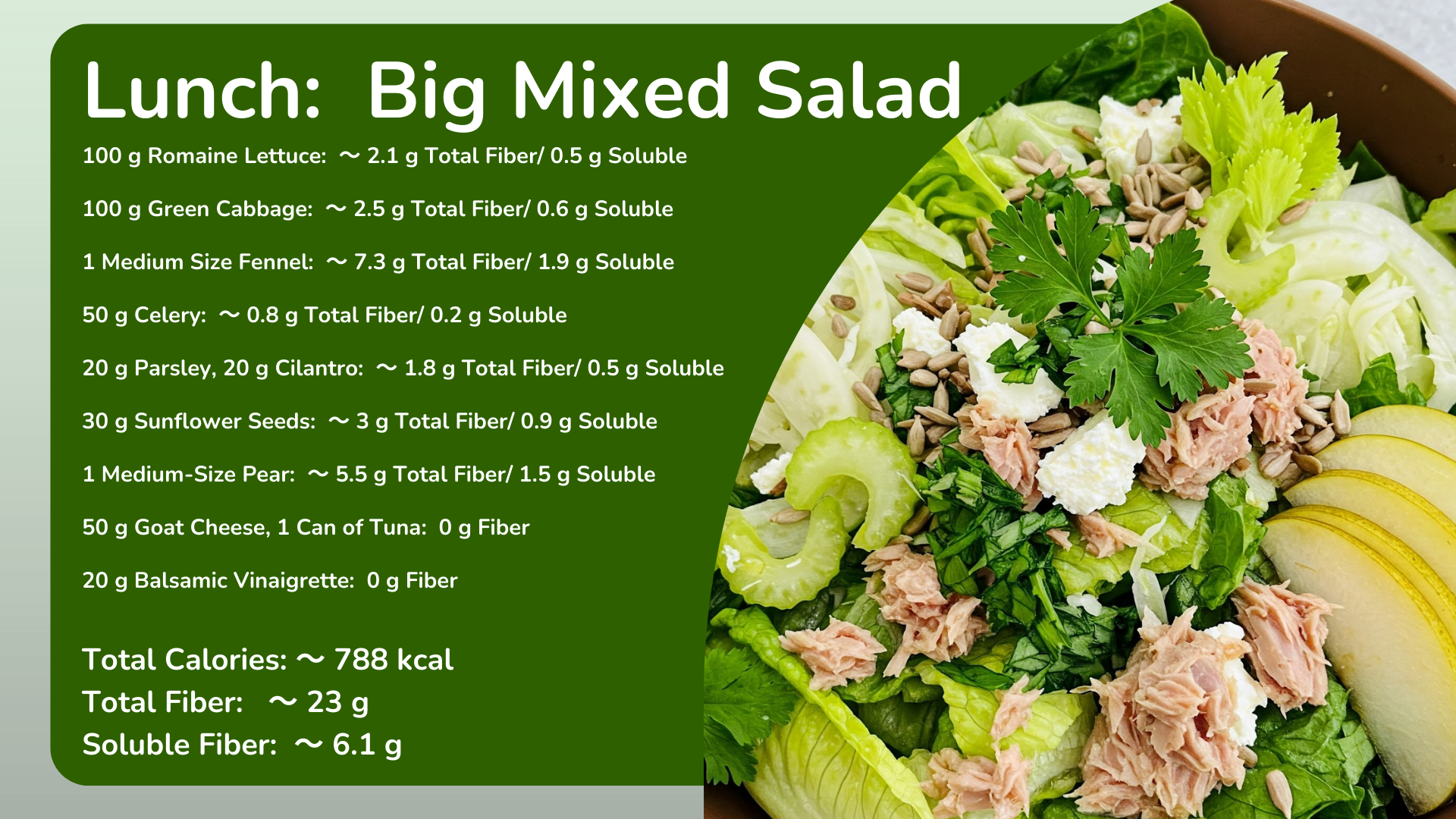 然后,午餐时,我喜欢吃一大盘混合沙拉,如下图所示,里面有各种绿叶蔬菜和不同种类的蔬菜和水果。我喜欢添加芹菜、茴香,也许还有梨,所有这些都富含纤维。再加上金枪鱼和山羊奶酪,以补充蛋白质,以及烤葵花籽,以增加脆度。像这样的沙拉富含纤维。而且很容易做出不同的变化:用烟熏鲑鱼或烤鸡代替金枪鱼。用一些坚果代替葵花籽。用苹果代替梨。有些日子我会吃山羊奶酪,其他日子我会吃羊乳酪或一些帕尔马干酪片。可以看到,包括自制的醋汁,这个版本大约有 788 千卡热量,总纤维超过 23 克,可溶性纤维为 6 克。仅凭这顿午餐,我就完成了目标纤维摄入量的一半以上。