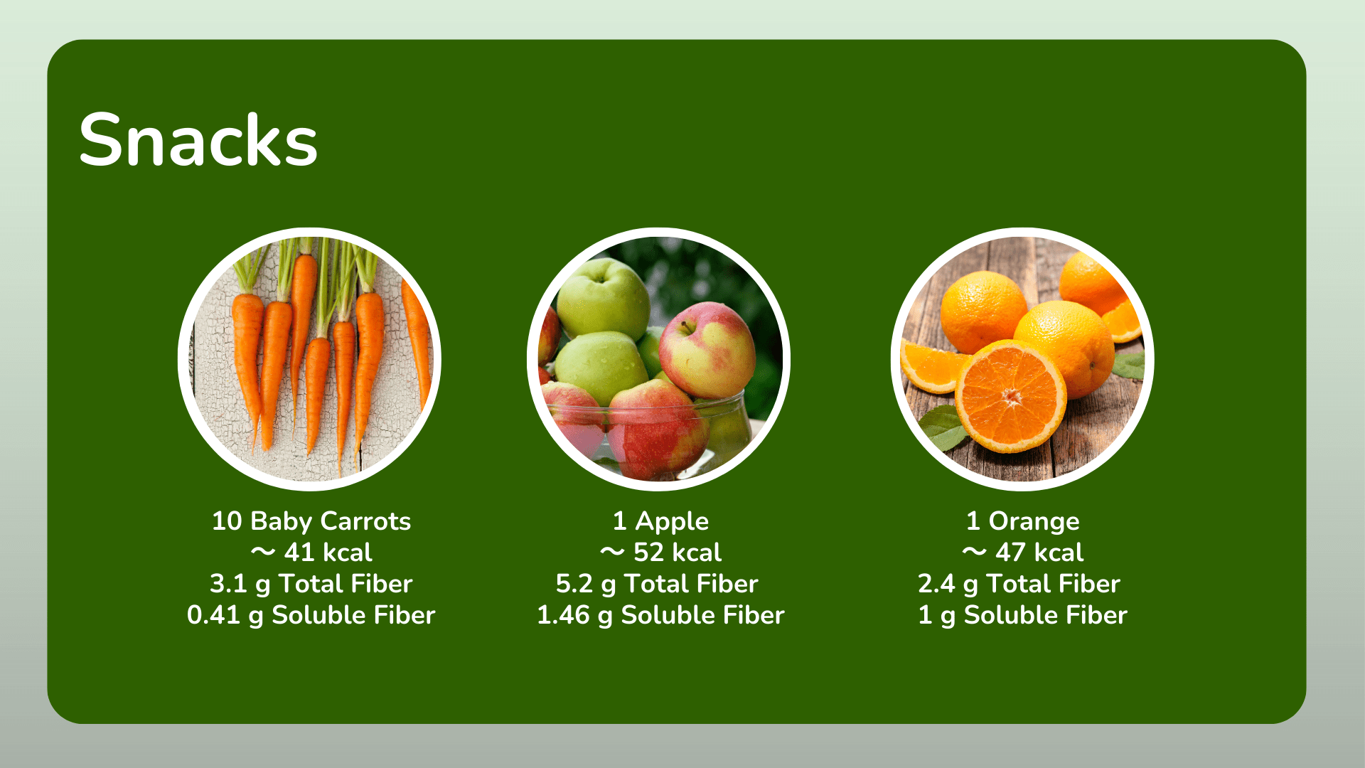 至于零食,我可能会吃一些胡萝卜、一个苹果和一个橙子,这样我一天的纤维摄入量就可以增加 10 克左右。