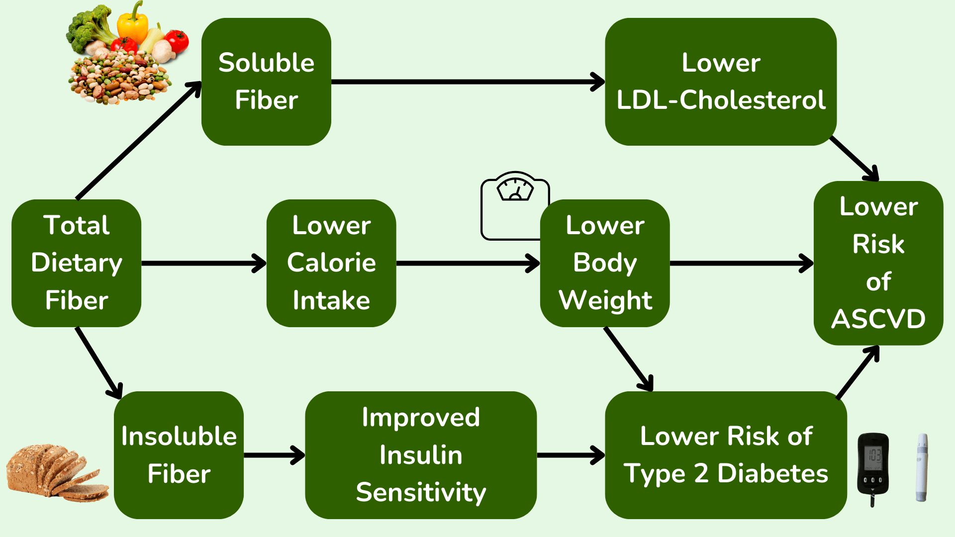 膳食纤维使每卡热量的食物更能让人饱腹,从而降低热量摄入量和体重。可溶性纤维可降低低密度脂蛋白胆固醇,而非可溶性纤维可改善胰岛素敏感性。这些作用共同作用,可显著降低动脉粥样硬化性心血管疾病的风险。