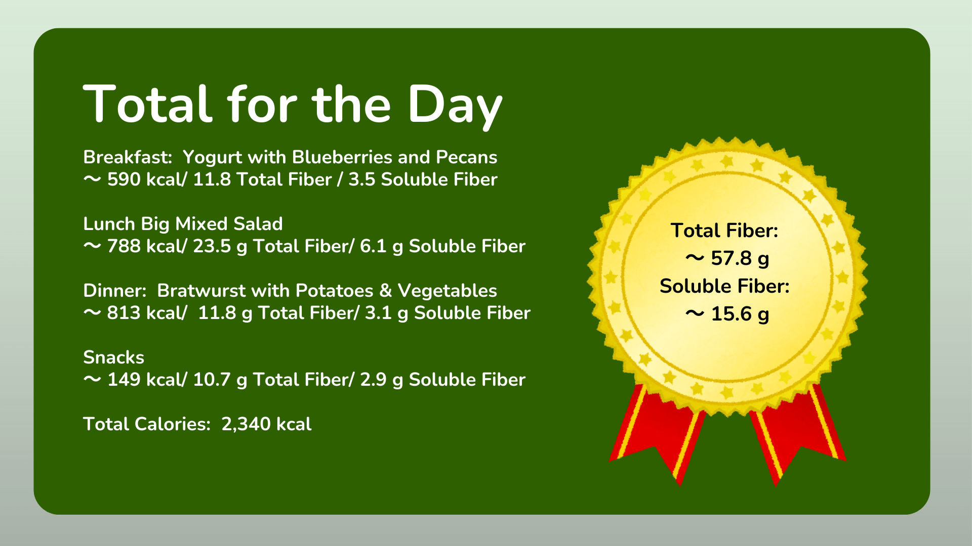一整天的纤维摄入量应该是多少?我以自己为例,分享我平常一天可能会吃的东西。我猜我每天需要大约 2400 千卡来维持体重,另外根据我的活动水平可能还需要一点额外摄入量,所以我每天应该摄入大约 38 克的总纤维。现在,我通常不记录我的食物摄入量,也从未主动记录我的纤维摄入量。我只是优先考虑大量食用各种水果、浆果和蔬菜作为大多数膳食的基础,而且我经常在一天中吃其他富含纤维的食物,如豆类、全谷物或坚果。