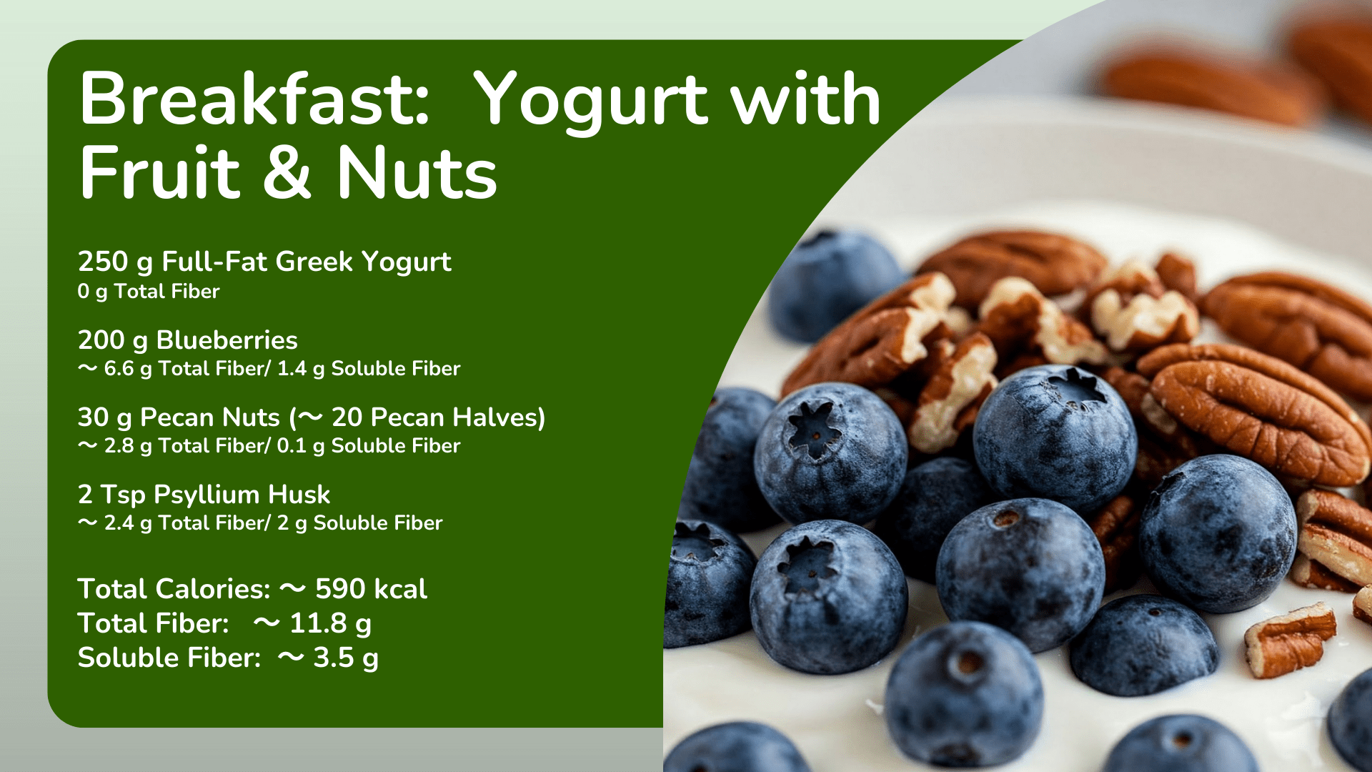 我经常以希腊酸奶、山核桃和蓝莓作为早餐开始新的一天(见下图)。蓝莓,或者说所有的浆果,都是很好的纤维来源。可以看到,我还在酸奶中加入了两茶匙车前草壳,这让酸奶稍微变稠了一点。总共约 590 千卡热量,约 12 克纤维,其中 3.5 克是可溶性纤维。这顿早餐让我饱了好一阵子。