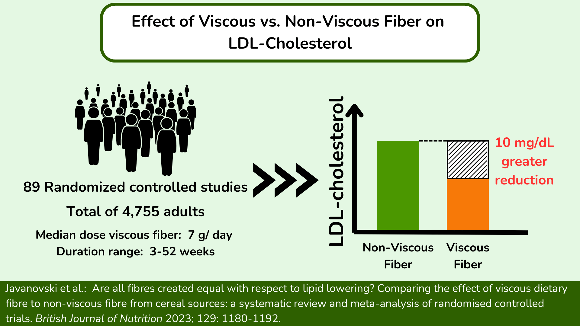 在 2023 年发表的一项对 89 项随机对照试验的系统评价和荟萃分析中,作者比较了粘性纤维和非粘性纤维对 4,755 名成年人中 LDL 胆固醇的影响。粘性纤维的中位剂量为每天 7 克,持续时间为 3 至 52 周。平均而言,粘性纤维比非粘性纤维多降低 LDL 胆固醇 10 mg/dL。