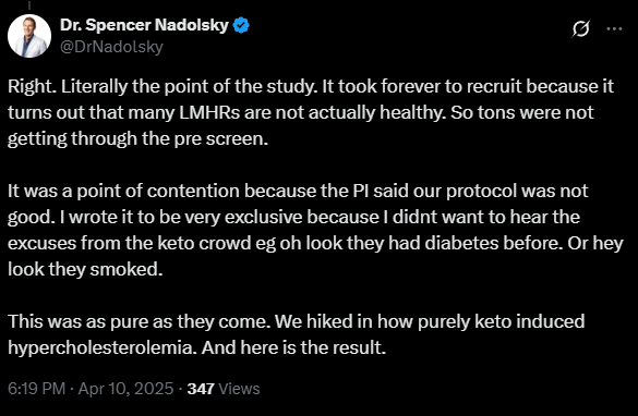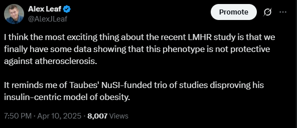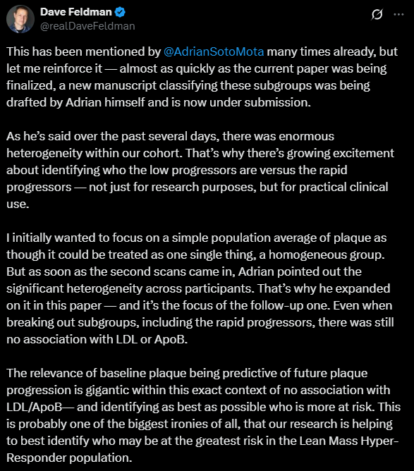 话虽如此,正如我在 X 上所说,Keto-CTA 研究的要点不容忽视:LMHR 表型并不能预防动脉粥样硬化。相反,它似乎与比我们预期更严重的斑块进展相关,即使在代谢健康状况良好的情况下也是如此。