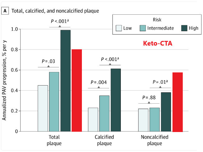 为了更清楚地说明这一点,在Nakanishi 等人的研究中,尽管只有 13% 的参与者的 CAC 评分为零,而 69% 的参与者的 CAC 评分超过 100,但平均 PAV 增幅为 0.7%。这 0.7% 的增幅比 Keto-CTA 研究中 CAC >100 的 LMHR 所经历的增幅 (2.4%) 低三倍多。