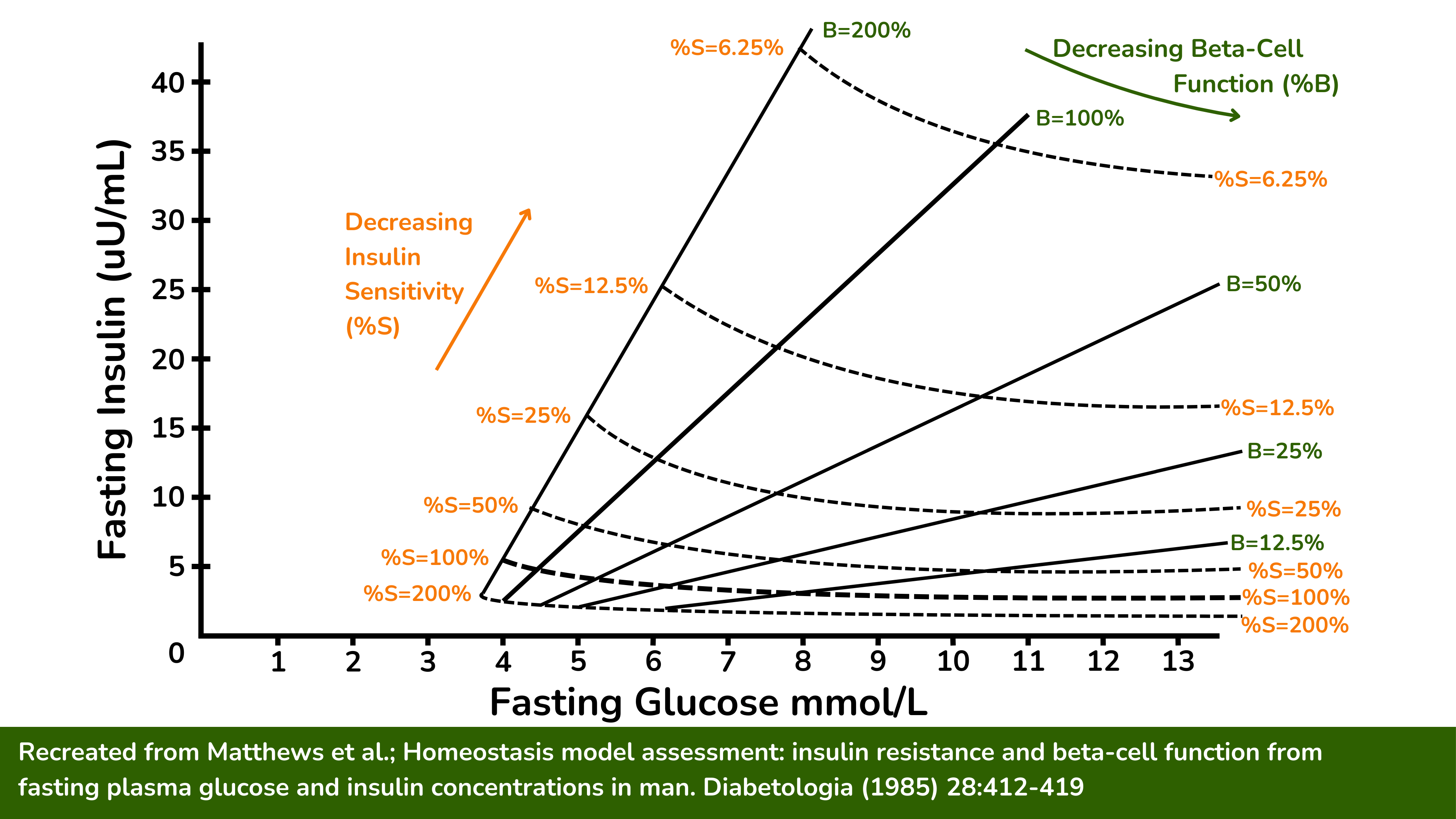 该图基于空腹血糖和胰岛素浓度,用于估计 HOMA-%S(胰岛素敏感性指标)和 HOMA-%B(胰腺 β 细胞功能指标)。