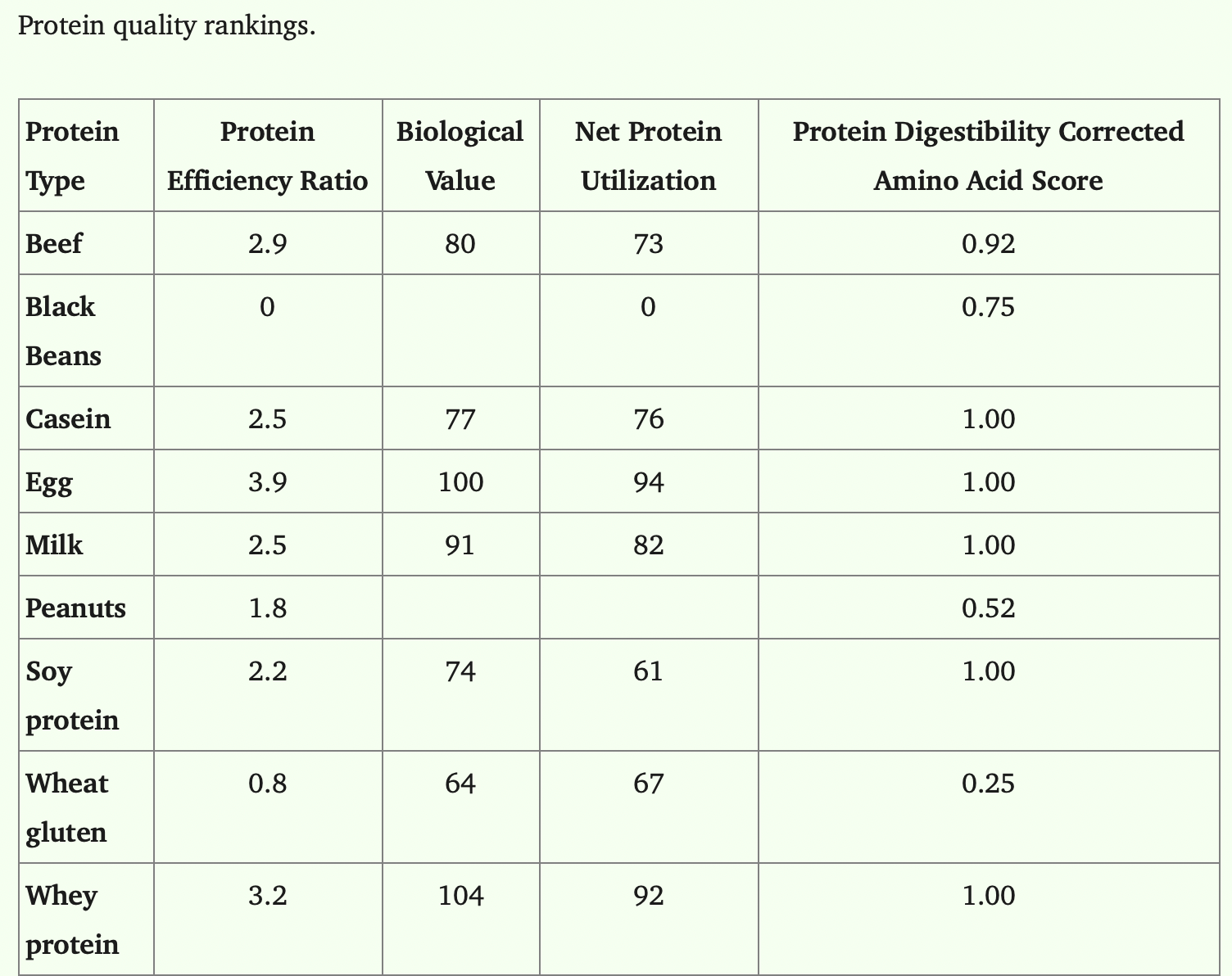 根据蛋白质效率比 (PER)、生物学价值 (BV)、净蛋白质利用率 (NPU) 和蛋白质消化率校正氨基酸评分 (PDCAAS) 等多项指标,乳蛋白(如酪蛋白、乳清蛋白)和牛肉蛋白的质量普遍优于大多数植物蛋白(如小麦谷蛋白、大豆蛋白、黑豆蛋白)。