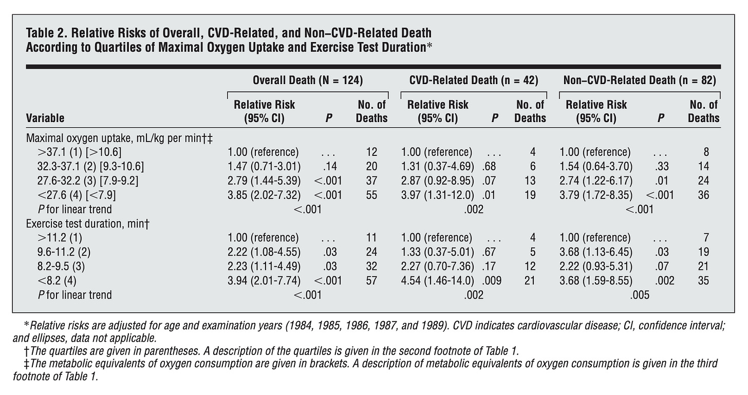 这些研究实际上表明,在难度不断增加的跑步机挑战中坚持更长时间是长寿的一个有力预测指标。* 现在请注意:您可以通过在跑步机上重复这些测试来测试自己能坚持多久,如果您是当地健身房的会员或拥有跑步机,则可以免费进行测试;否则,您需要支付当地健身房一日通行证的费用。 # 这些测试与最大摄氧量(VO2max)有何关系? 美国运动医学会 (ACSM) 推荐使用标准公式将跑步机测试结果转换为最大摄氧量 (VO2max)。但在 2025 年版中,他们并未引用证据来证明这些公式的合理性或准确性。目前似乎没有任何系统评价或荟萃分析研究使用这些方案中的跑步机参数来预测 VO2max。 因此,我首先自行查阅了相关文献。 最大摄氧量是指你在剧烈运动期间摄取和利用氧气的最大能力。 由于在跑步机上运动需要消耗氧气,因此,你的最大氧气利用率与你在跑步机上的最大运动表现相关,这是合乎逻辑的。 然而,你的表现也取决于你的技能、你利用氧气产生 ATP 的效率、你的酸碱平衡、你的中枢神经系统耐受力、你的心理韧性以及其他参数。 重要的是,这些研究进行的跑步机测试都达到了“自愿失败”的程度,这意味着受试者是因为不想继续下去而放弃。否认心理韧性在其中发挥作用是天方夜谭。 最严格的 VO2max 测试方案采用“趋于平稳”的标准,该标准由亨利·朗斯特里特·泰勒于 1955 年提出。他的研究最初确立了氧气消耗量作为有氧适能的核心指标,他于 1983 年因不明原因去世,享年 72 岁。 在“趋于平稳”的标准中,研究人员明确指出,即使你更加努力地工作,你也不会消耗更多的氧气。也就是说,你已经达到了氧气消耗的生物学最大值。 如果不采用这些标准,你就是在测试放弃的影响,而不是测试达到生物学最大值的影响。 对于这种氧气摄取水平,使用 VO2peak 而非 VO2max 更为恰当。也就是说,这是研究中观察到的峰值,但不一定是你的生理极限。 放弃点与生物学极限的接近程度可能很大程度上取决于研究对象以及跑步机上受试者的指导者。运动员更有可能在达到自主力竭之前就达到氧气输送的生物学极限,而研究人员对待受试者的态度会影响他们挑战自主力竭直至达到生物学极限的积极性。 1974 年的一篇论文强调了研究人员在激励参与者方面的作用,该论文报道称:“鼓励受试者做到最大努力,他们的外表也与这一目标相符。” 这是否意味着研究人员在研究开始时冷静地告诉他们这样做,然后确认他们似乎听从了指示? 或者,这是否意味着,即使参赛者看起来还有 25 秒就要被担架抬出去,他们仍然扯着嗓子喊着“感受灼烧感,现在不要放弃,失败绝不是一个选项!!!”? 显然,这种行为可能会对受试者能否将自主失败点推向氧气传输的生物学最大值产生天壤之别的影响。 如果你意识到自主力竭时的氧气消耗量(峰值氧气)不是最大摄氧量,但如果参与者有足够的动力达到最大摄氧量,它就可能是最大摄氧量,那么你就能很容易地理解为什么从一个人的实验室得出的相关性总是很强,而从另一个人的实验室得出的相关性总是很弱。 对于所有不需要氧气摄入量达到平台期来确定最大摄氧量的研究,我将使用术语“VO2peak”。 论文中报告的相关性以相关系数®表示,该数值的平方代表跑步机测试结果的变化能够解释VO2peak变化的程度。为了便于理解,我将r平方值称为跑步机测试的预测效用,其范围为0-100%。 罗伯特·A·布鲁斯,这位被誉为“跑步机运动压力测试之父”的心脏病专家,于2004年因癌症去世,享年87岁。他于1973年制定了布鲁斯方案的方程式。在约300名男性和女性中,跑步机运动表现的预测效用为82%。考虑性别因素后,这一效用提升至85%。 布鲁斯的测试在受试者意志力衰竭、出现负面症状或心脏异常时停止,并且没有尝试寻找氧气摄入量趋于平稳的情况。 迈克尔·波洛克是一位运动科学家,他率先提出了美国每周进行有氧运动的建议,并于 1998 年因中风去世,享年 61 岁。 波拉克分别于1976年和1982年对男性和女性进行了各种跑步机测试的预测效用测试。巴尔克方案对男性的预测准确率达到85%,而布鲁斯方案的预测准确率仅为77%。女性的表现略好一些,巴尔克方案的预测准确率为88%,布鲁斯方案的预测准确率为83%。 波拉克报告称,他测试了男性“氧气水平趋于平稳”的影响,并表示相关性“没有显著差异”,但他并未公布具体数据,只是告诉我们69%的男性达到了氧气水平平台期。统计学上没有显著差异并不意味着预测效用没有大幅降低。他没有公布数据表明,他可能不喜欢论文中呈现的结果。 波拉克在其1976年的论文中引用了维克多·弗罗利彻1974年发表的一篇论文,该论文显示预测效用较低。弗罗利彻曾在斯坦福大学和美国空军航空航天医学学院(USAFSAM)工作,如今他仍然健在,享年84岁。 研究人员对15名男性进行了为期九周的测试,每周一次。他们将前三周的结果汇总,并与后三周的汇总结果进行比较。结果如下: * 在 Bruce 方案下,最大跑步机运动时间从 12 分钟增加到 14 分钟,增幅为 17%,但峰值摄氧量没有变化。 * 根据 Balke 方案,最大跑步机运动时间从 21 分钟增加到 26 分钟,增幅达 24%,但峰值摄氧量没有变化。 * 在整个研究过程中,Bruce 方案的预测效用始终保持在 67%。 * Balke 方案的预测效用从研究开始时的 54% 提高到研究结束时的 74%。 这项研究的一个关键发现是,每周在跑