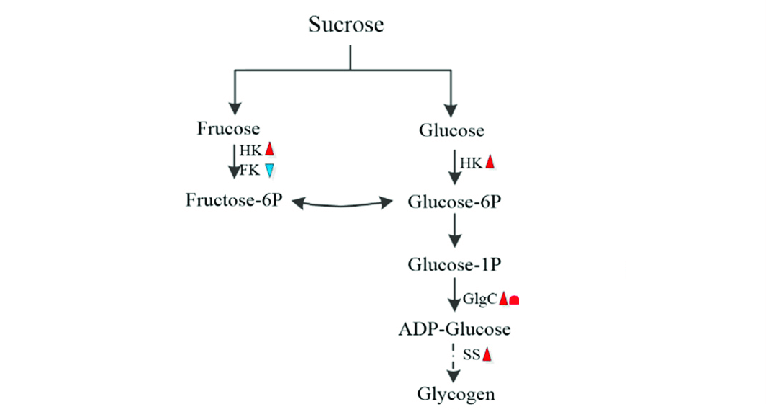- 葡萄糖部分以肝糖原的形式储存,受酶 GSK-3β(糖原合成酶激酶-3β;具有抑制作用)的调节。
