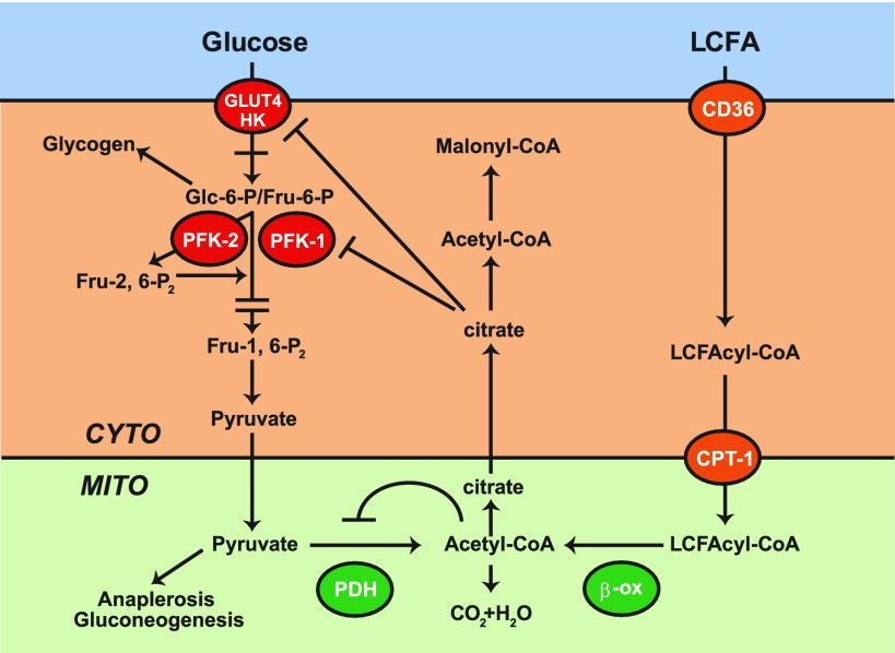 - 这些游离脂肪酸会抑制葡萄糖进入细胞(导致高血糖)和丙酮酸脱氢酶(PDH),丙酮酸脱氢酶是让葡萄糖进入线粒体的酶。