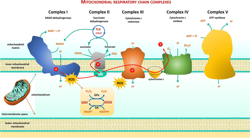 - NADH 和 FADH₂ 将电子传递给 CoQ10(泛醌),然后沿着复合物链向下传递(I → III → IV)。