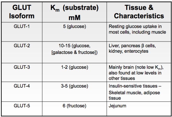 - 果糖可以通过 GLUT5 进入细胞,而无需胰岛素的参与,而且有趣的是,它还能增强葡萄糖的吸收(胰岛素模拟效应);这也是为什么在淀粉之前吃水果可以降低餐后血糖反应的原因之一。