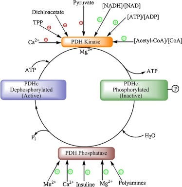 - 乙酰辅酶A过量、ATP高、NADH与NAD比值高、皮质醇、胰高血糖素和肾上腺素可增加PDK活性。