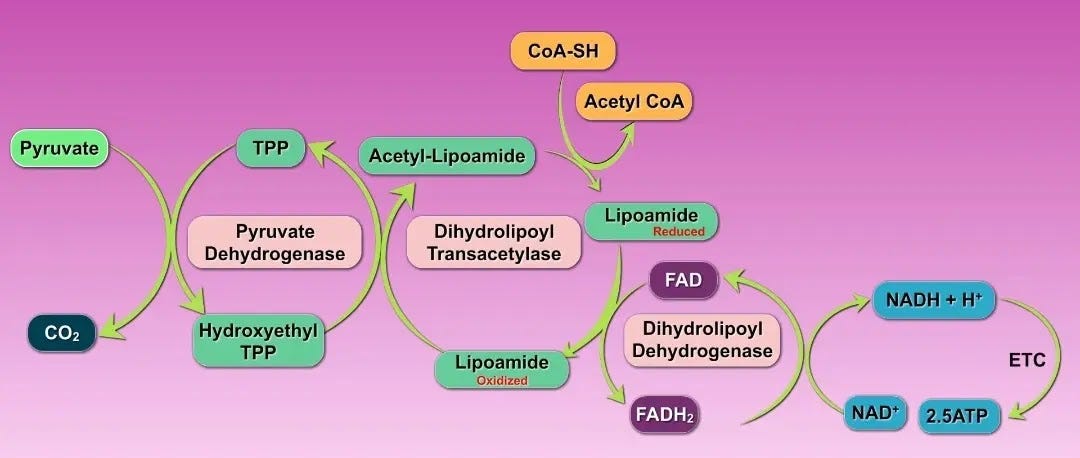 - 甲状腺功能抑制、维生素B1、镁、维生素B2、维生素B3、维生素B5水平过低或α-硫辛酸(ALA)缺乏都会加重病情。从这张图中可以看到所有必需的营养素,以及丙酮酸脱氢酶(PDH)是一个相当复杂的酶复合物。