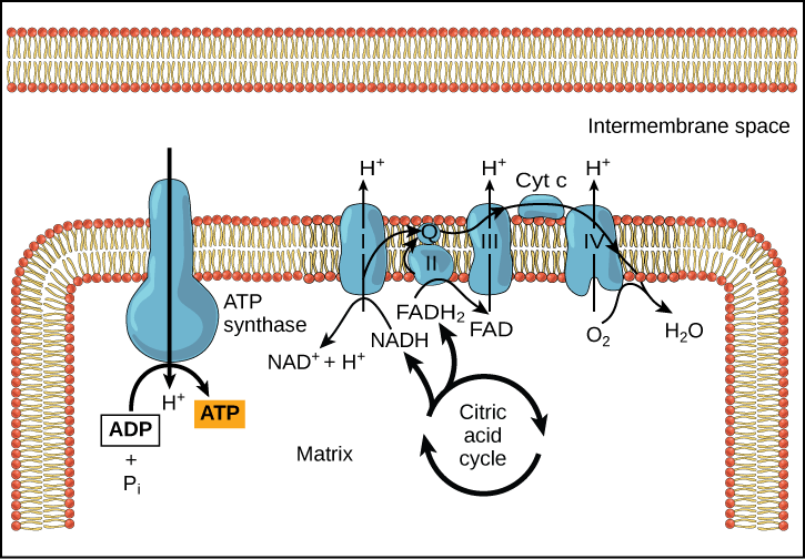 ETC中有5个复合体。NADH 将其电子提供给复合物 I,而 FADH2 将其电子提供给复合物 II。复合物 I 和 II 将它们的电子传递给复合物 III,然后是细胞色素 C 氧化物和复合物 IV,在那里产生水。