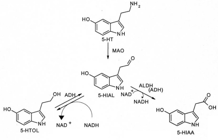 NAD 是血清素正常解毒所必需的。分解血清素的主要酶称为单胺氧化酶-A (MAO-A)。MAO-A 使用维生素 B2 和铜作为辅助因子,将血清素转化为 5-羟基吲哚-3-乙醛 (5-HIAL)。5-HIAL 然后可以被醛脱氢酶(使用 NAD)或醛还原酶(使用 NADH)分解,分别形成 5-羟基吲哚-3-乙酸 (5-HIAA) 和 5-羟基色氨酸 (5-HTOL)。