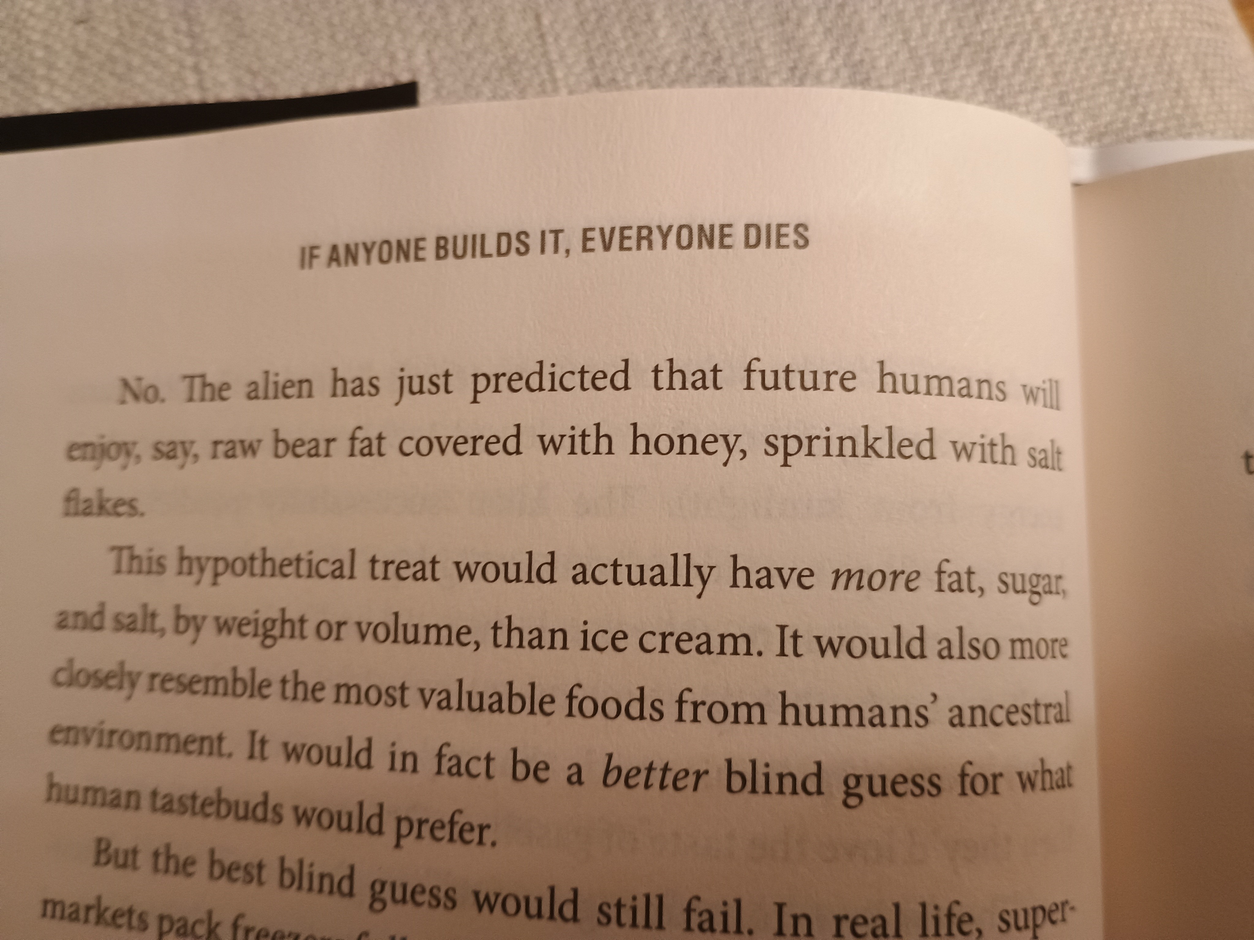 我同意,即便外星人知道我们渴望哪些营养物质,他们仍然会忽略人类所能创造的种种疯狂(例如,我们驯化奶牛比驯化熊容易得多)。我也同意,这同样适用于我们对人工智能的认知。但这一部分存在一个未明言的假设:熊油裹上蜂蜜,撒上盐片,真的不好吗?也许它味道鲜美,只是因为一些不实用的原因而不受欢迎。